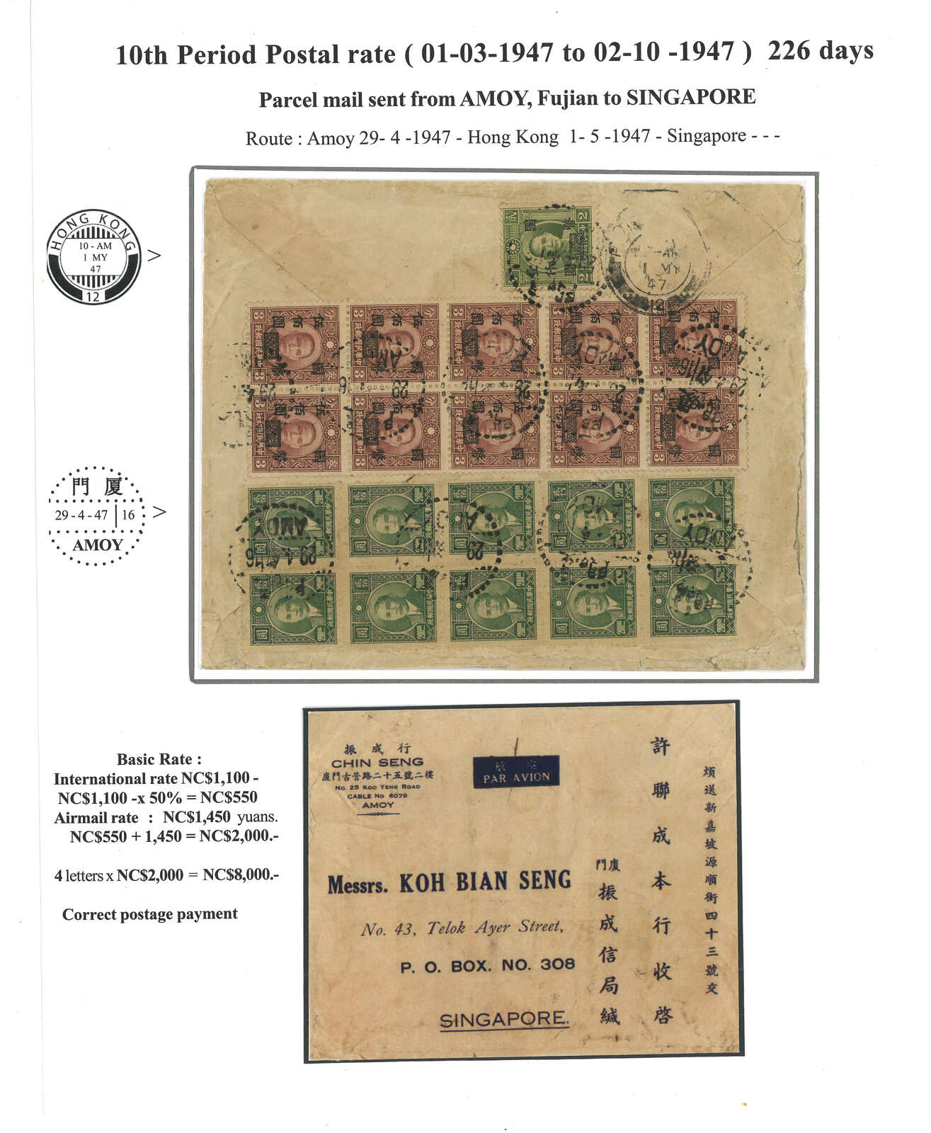 1947 (29 Apr) Huipi (receipt of remittance) bulk mail stating containing 4 letters from Amoy to Singapore, f.w. SYS x21, in total of $8000 (Huipi concessionary half rate $550 + airmail rate $1450 per letter), tied by Amoy