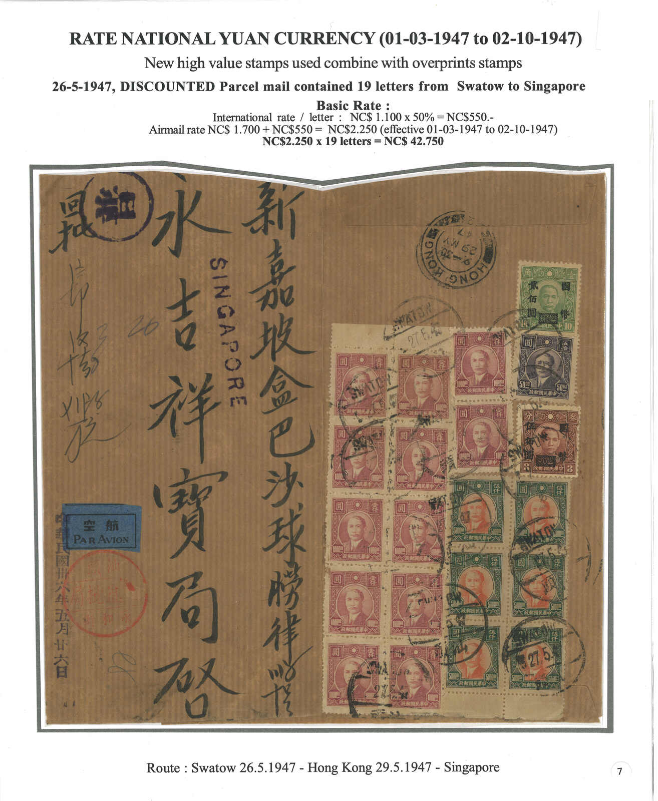 1947.5.26 回批總包,申報內裝回批19件,自汕頭寄新加坡,貼孫像共21枚,合42750元(每件回批特惠半費郵資550元 + 航空費1700元,共19件),銷汕頭三格漢英日戳。稀罕難得之僑批總包例子。封剖開以作展示。(Image 1)