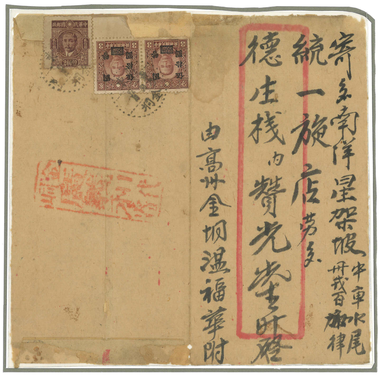 1940年代金桐寄新加坡,背貼孫像3枚合1200元,銷廣東金桐三格點線日戳,旁鈐“金桐廣義利代寄”直戳。封剖開以作展示。(Image 1)