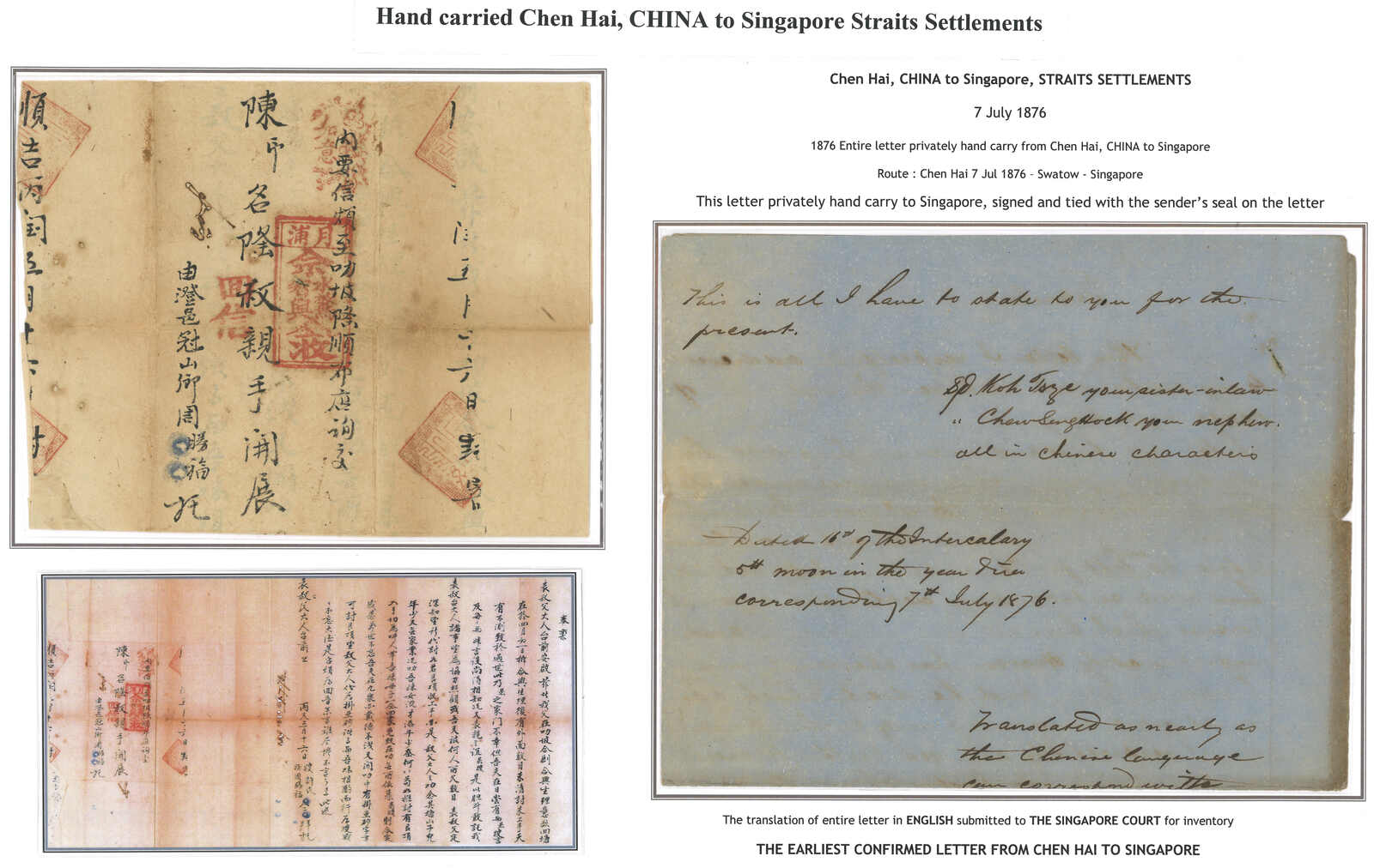 1876.7.7 澄海縣冠山鄉許氏托水客寄新加坡之郵簡,鈐“月浦”直戳。內容為請新加坡的親屬代為處理遺產糾紛。附有新加坡法庭譯為英文之文件作證。為已知最早之新加坡寄澄海信件。為一大珍品。2008年版許茂春著《東南亞華人與僑批》第202頁4-48a及4-48b原件。(Image 1)