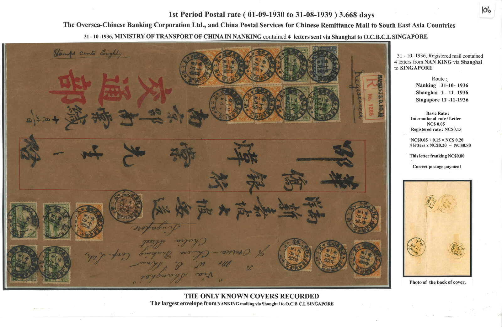 1936.10.31 交通部自南京寄新加坡華僑銀行。大型掛號包裹封,貼烈士 + 郵政開辦四十週年共19枚,合8角(反映內含四件信件,每件5分 +