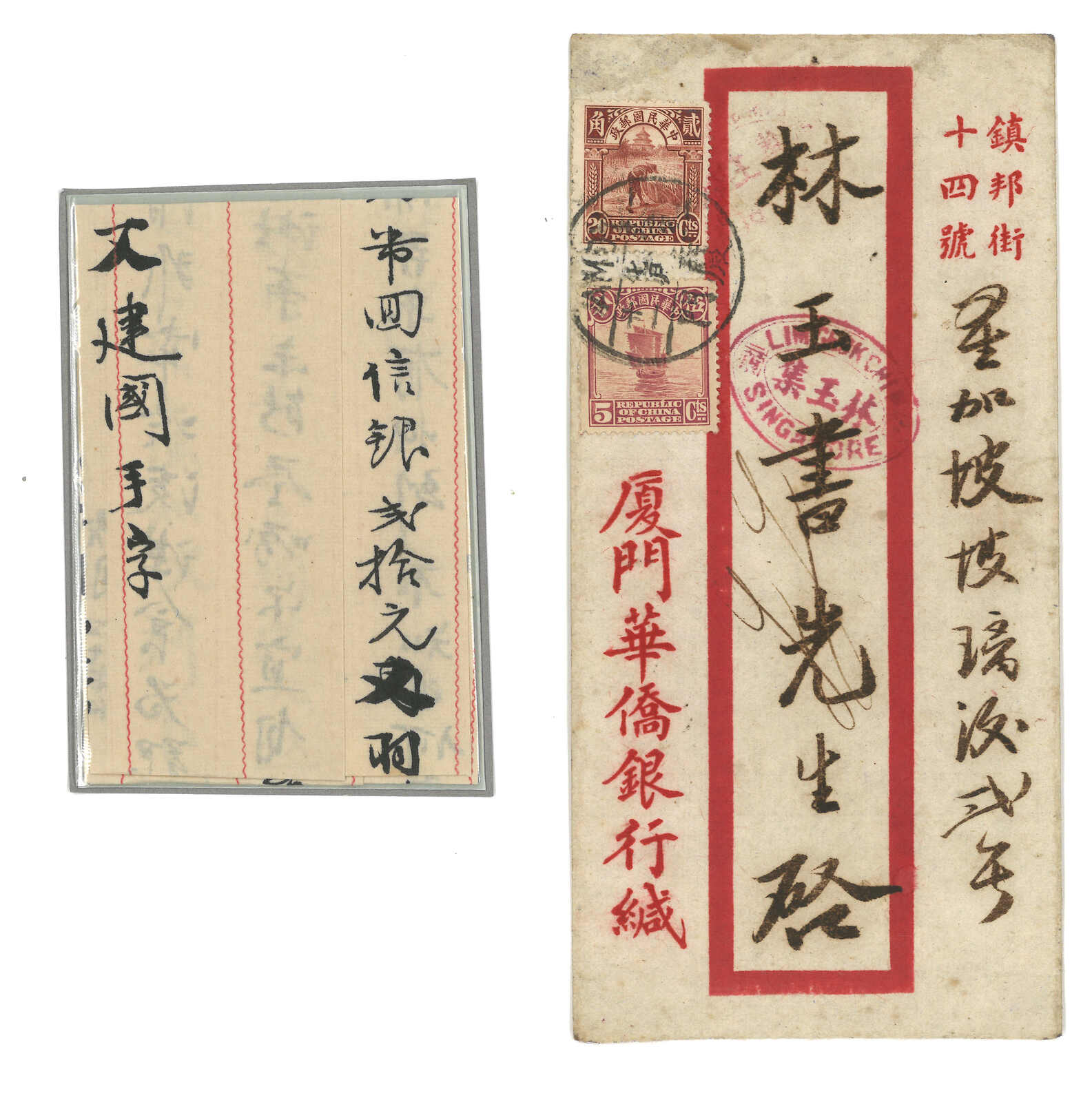 約1930年代廈門華僑銀行寄新加坡回批,貼帆船5分 + 農穫圖2角,銷廈門三格漢英日戳。旁鈐“林玉集”橢圓戳記。附原信。寄新加坡回批向來少見。(Image 1)