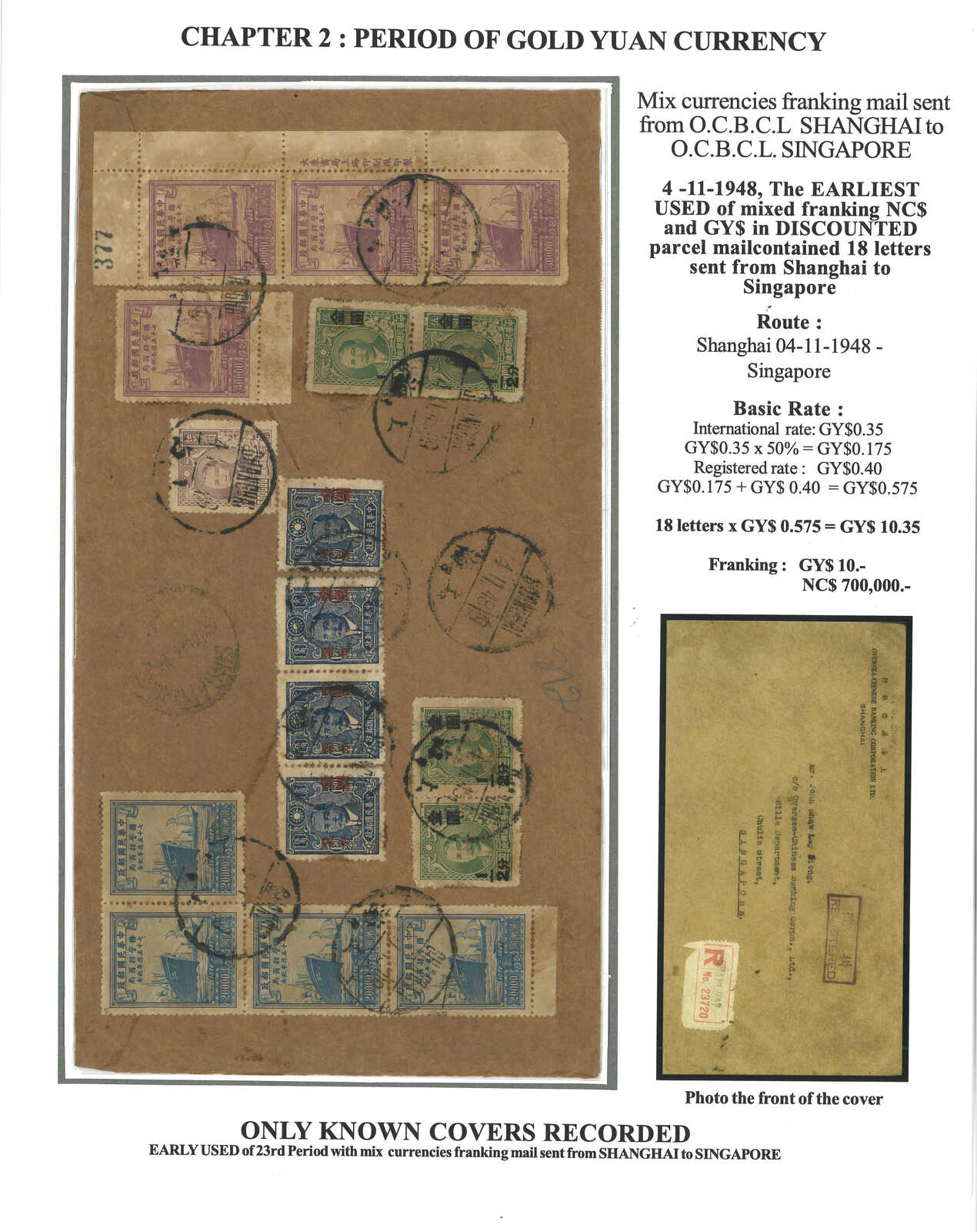 1948 (4 Oct) OCBC, Shanghai to OCBC, Singapore. Large parcel registered cover containing 18 letters, f.w. Dah Tung Print SYS + SYS surch Gold Yuan + Merchants Steam Navigation Co. x17, in total of in total of CNC $700,000 =