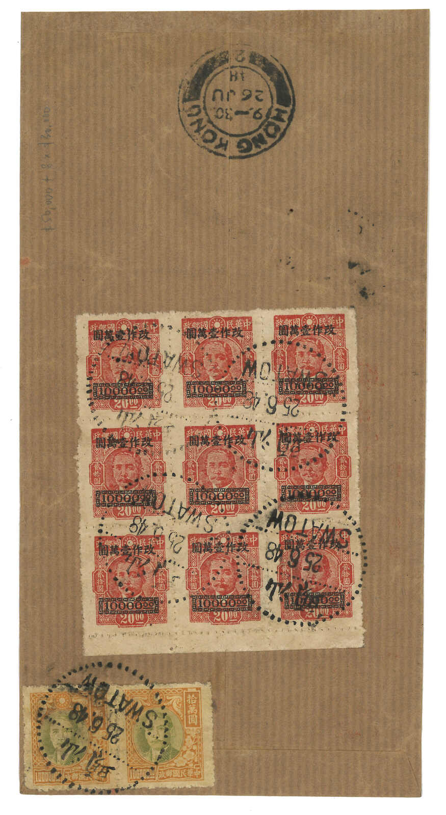 1948 Swatow (25 Jun) to Singapore. Airmail Huipi (receipt of remittance) cover, f.w. SYS $100000 in pair + surch $10000 in block of 9 on reverse, tied by Swatow bilingunal cds. Transit Hong Kong (26 Jun).