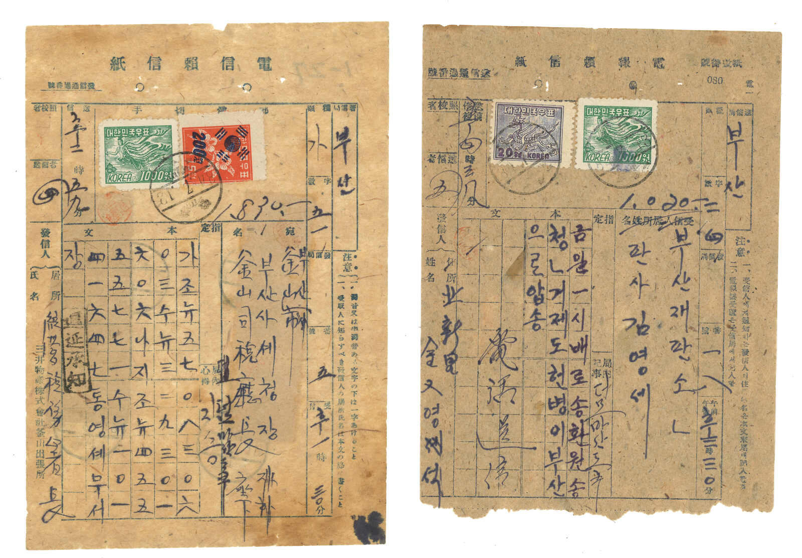 1951 and 1954 a pair of Korean telegrams, former in combination with war time surch 200w/15w + 2nd definitve issues in multiple while another f.w. 2nd definitve issue 20w + 100w.