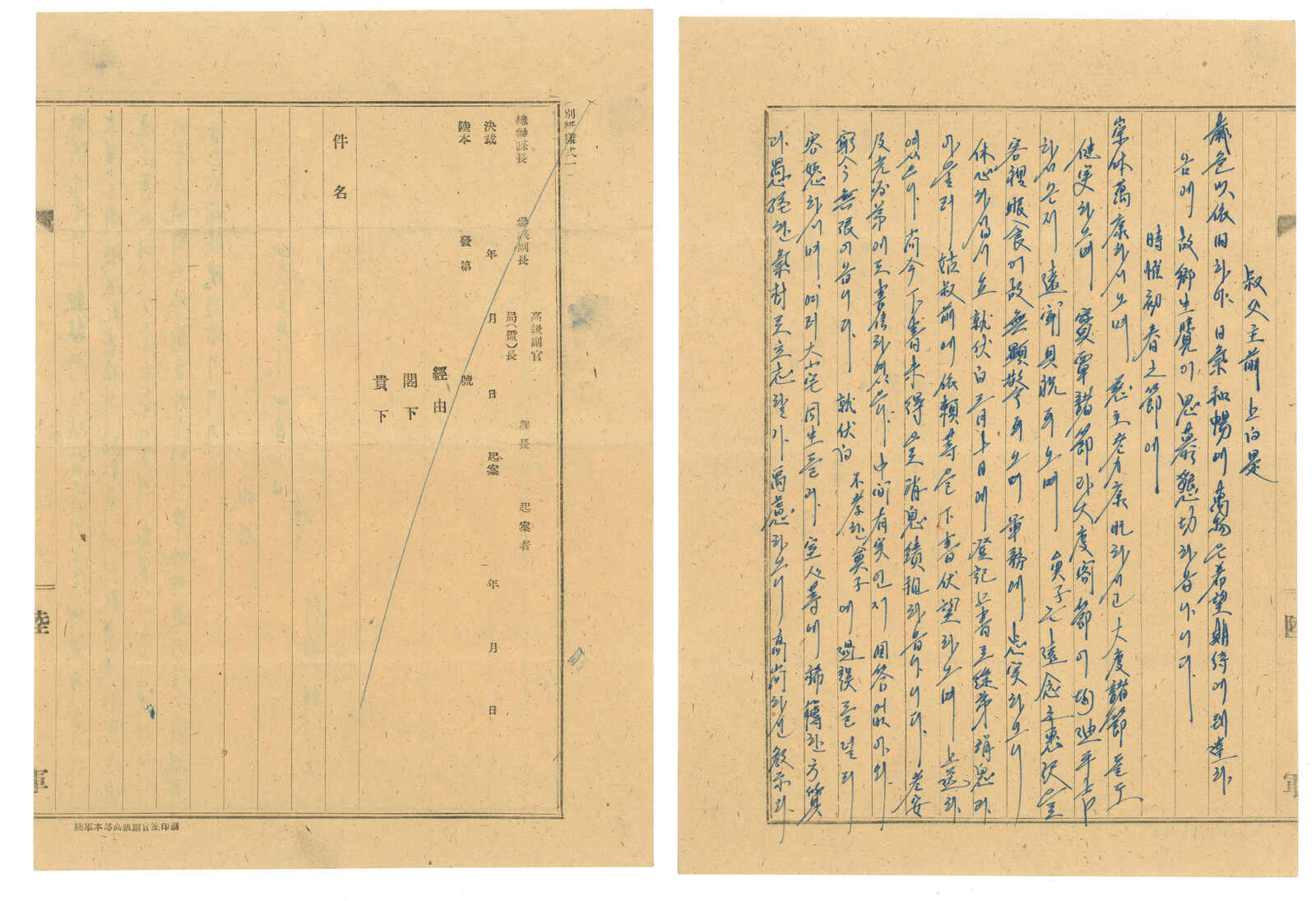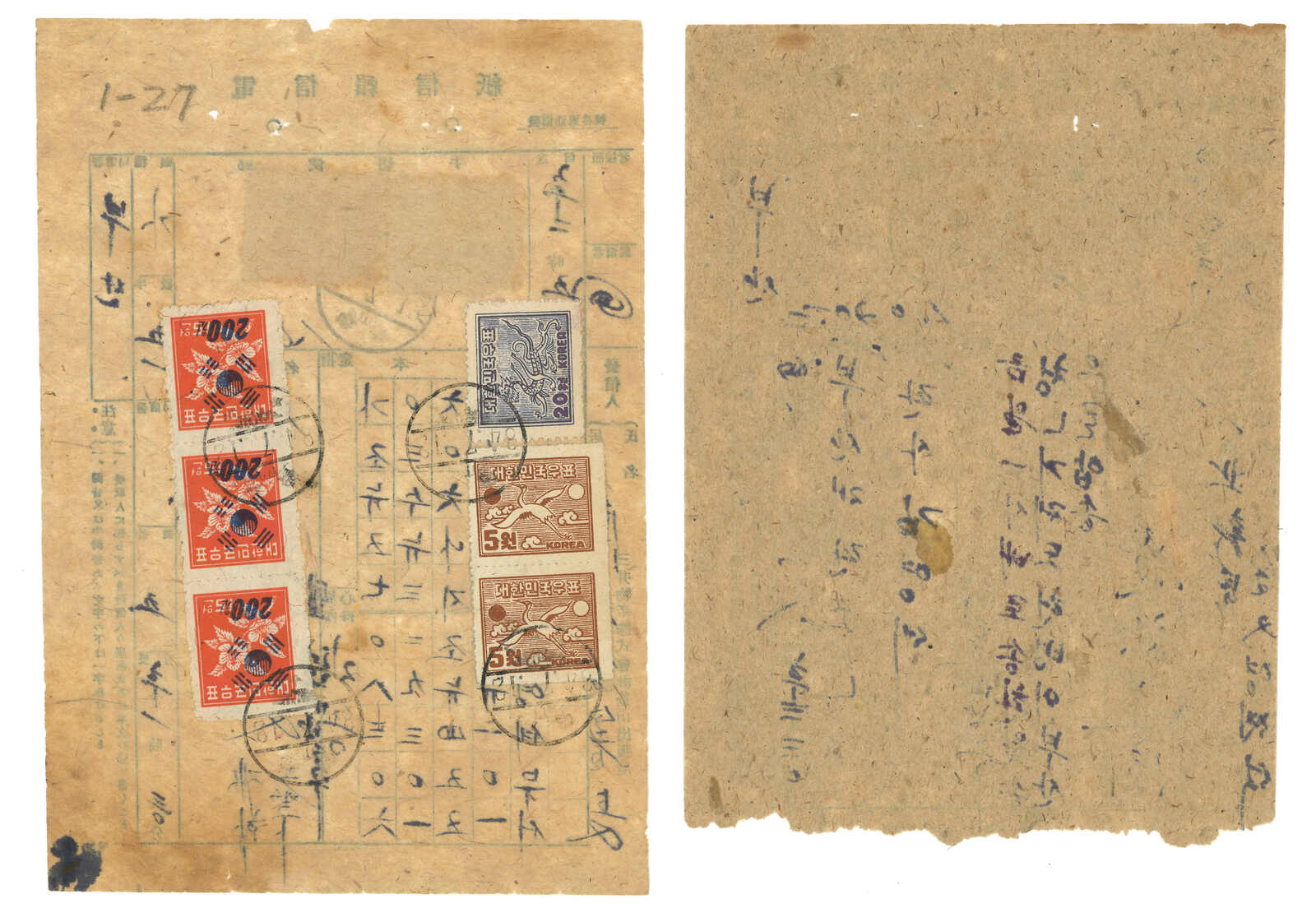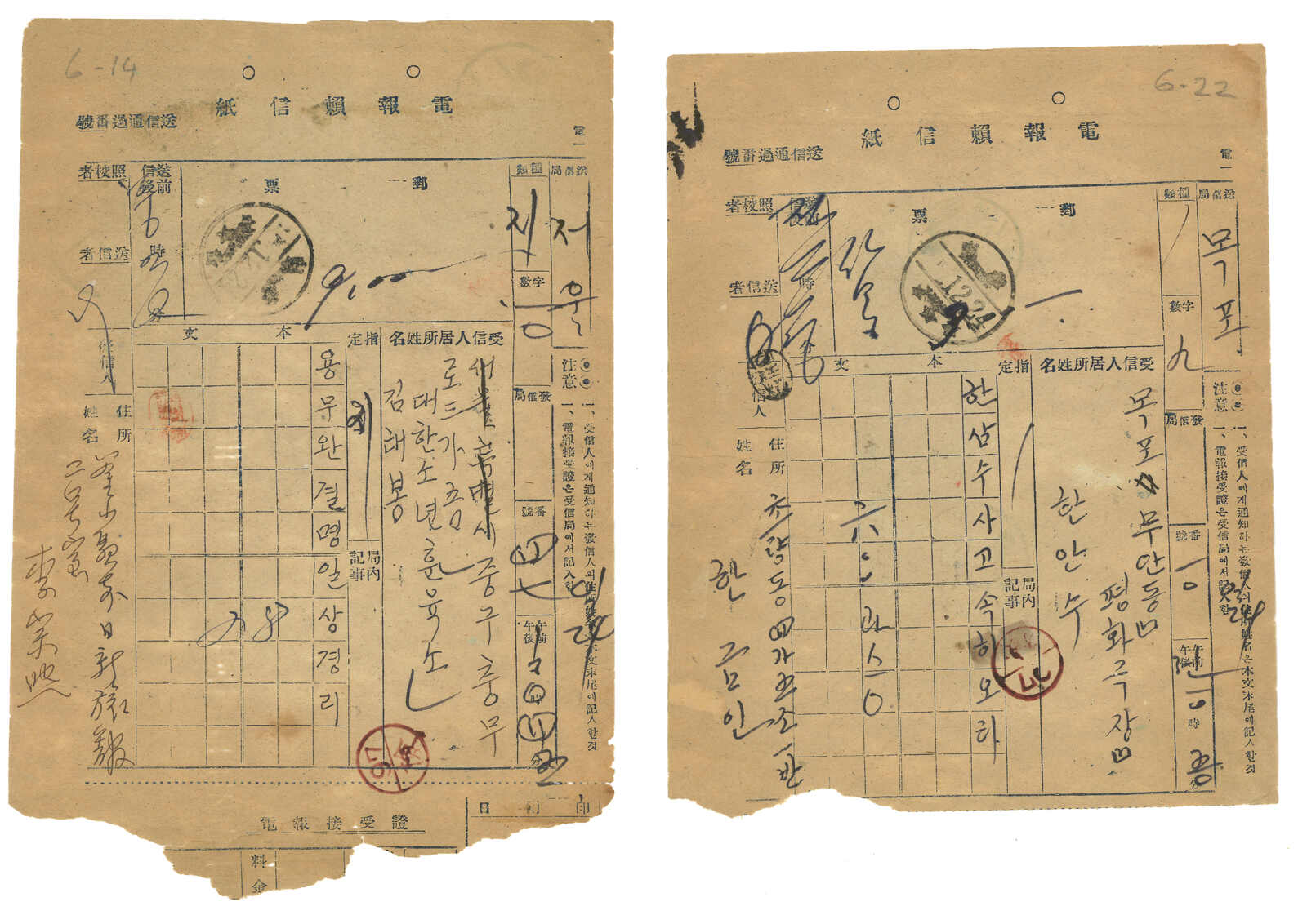 1951一對韓國電報紙,分別貼戰時改值200圜蓋15圜(KPDA D47)或韓國統一500圜(KPDA 71)3枚。(Image 1)