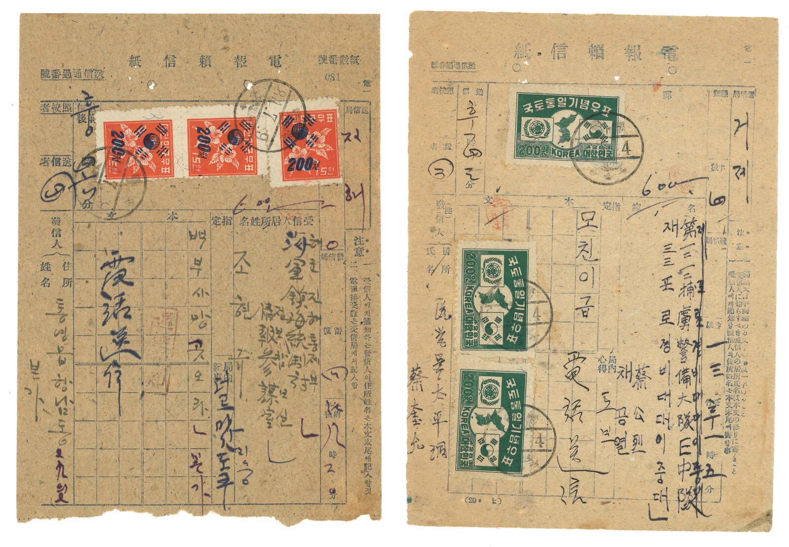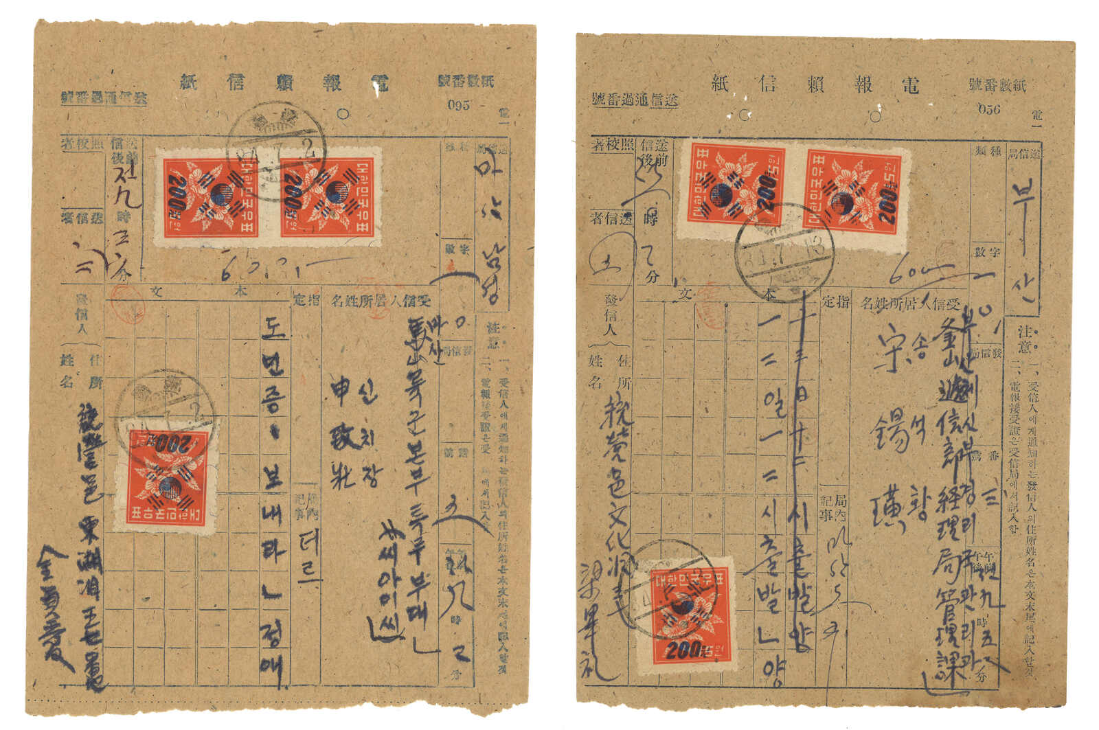 1951 a pair of Korean telegrams, f.w. war time surch 200w/15w x3 (KPDA D47A / D47B), tied by faint cds.