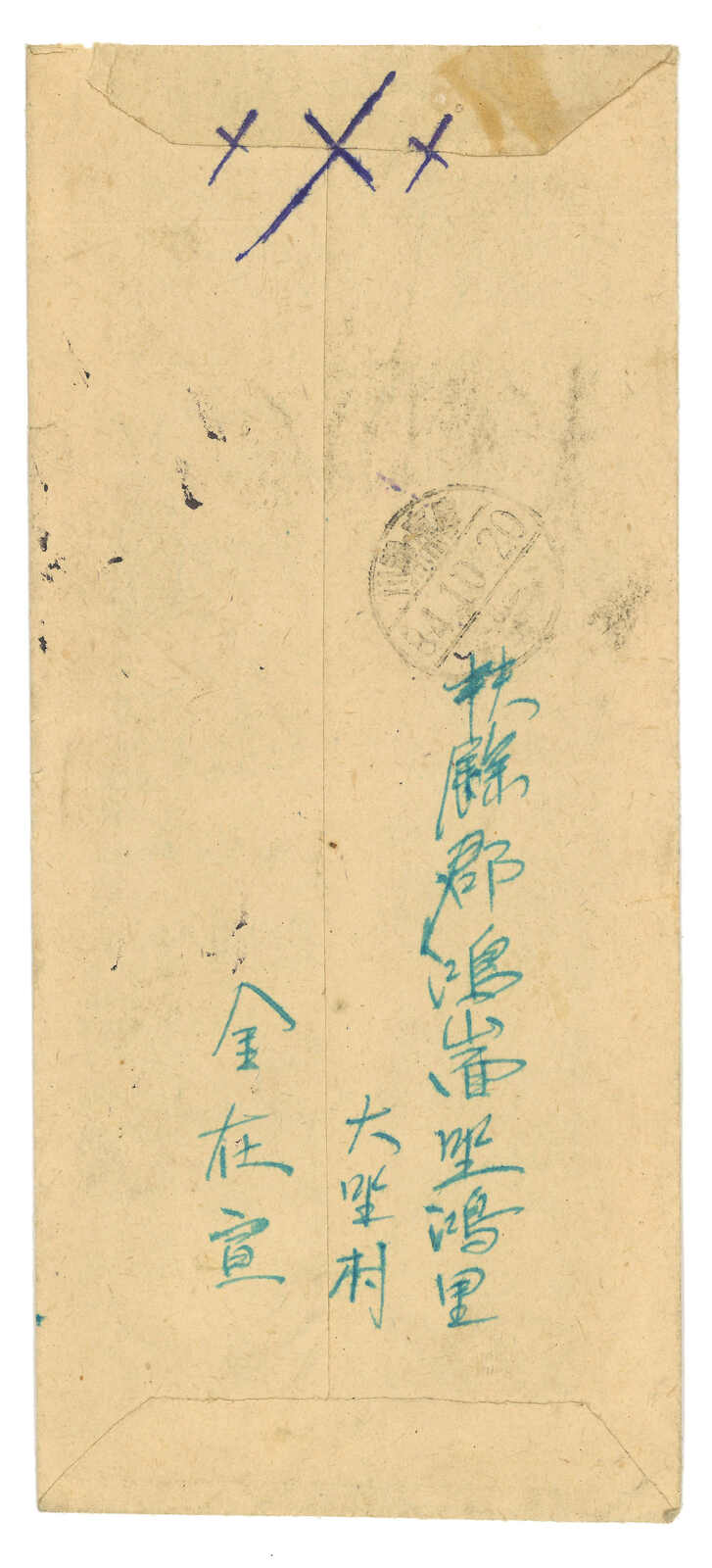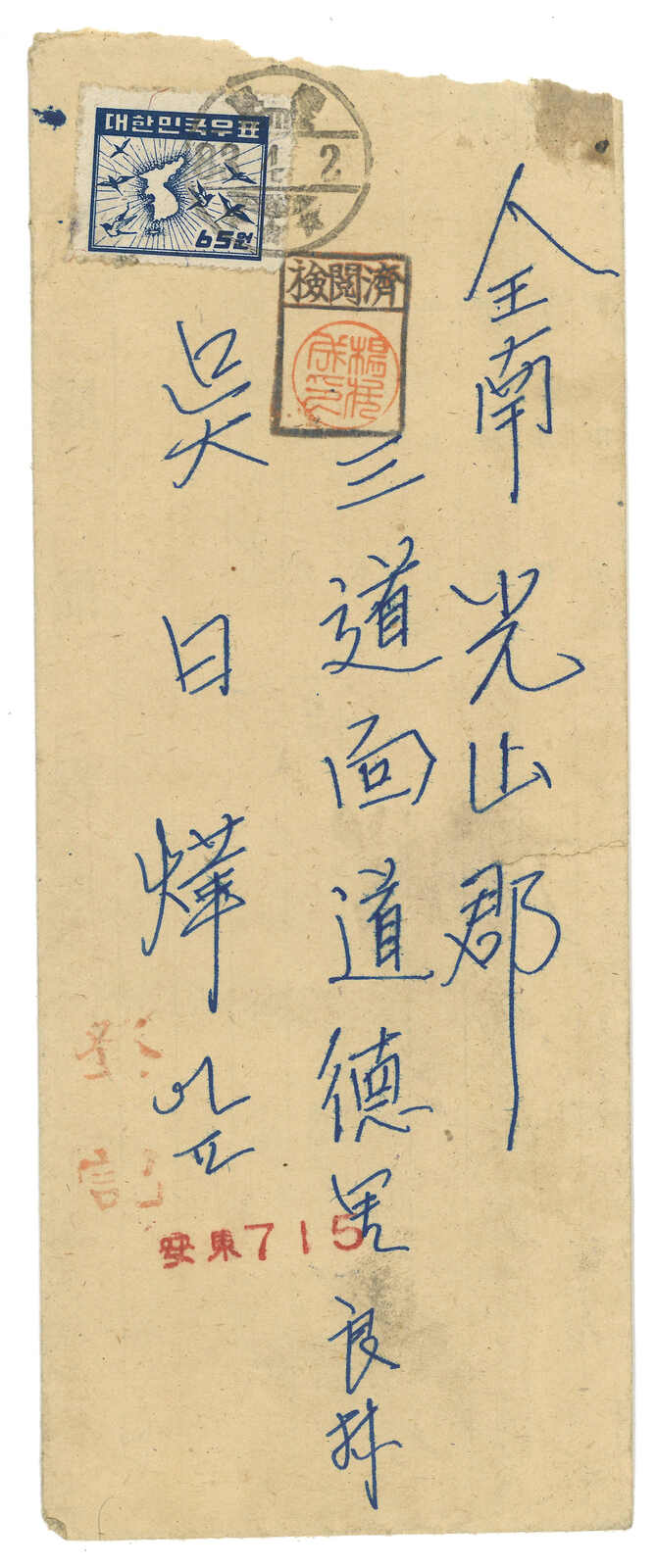 1950.4.2 安東軍寄全羅南道光山郡,貼大韓民國第一版普票65圜,旁鈐檢查章及檢查員名字章。附原信。(Image 1)