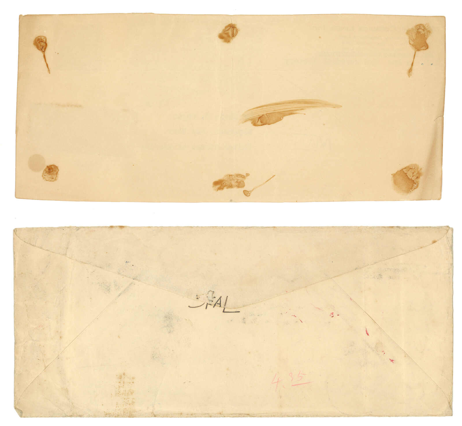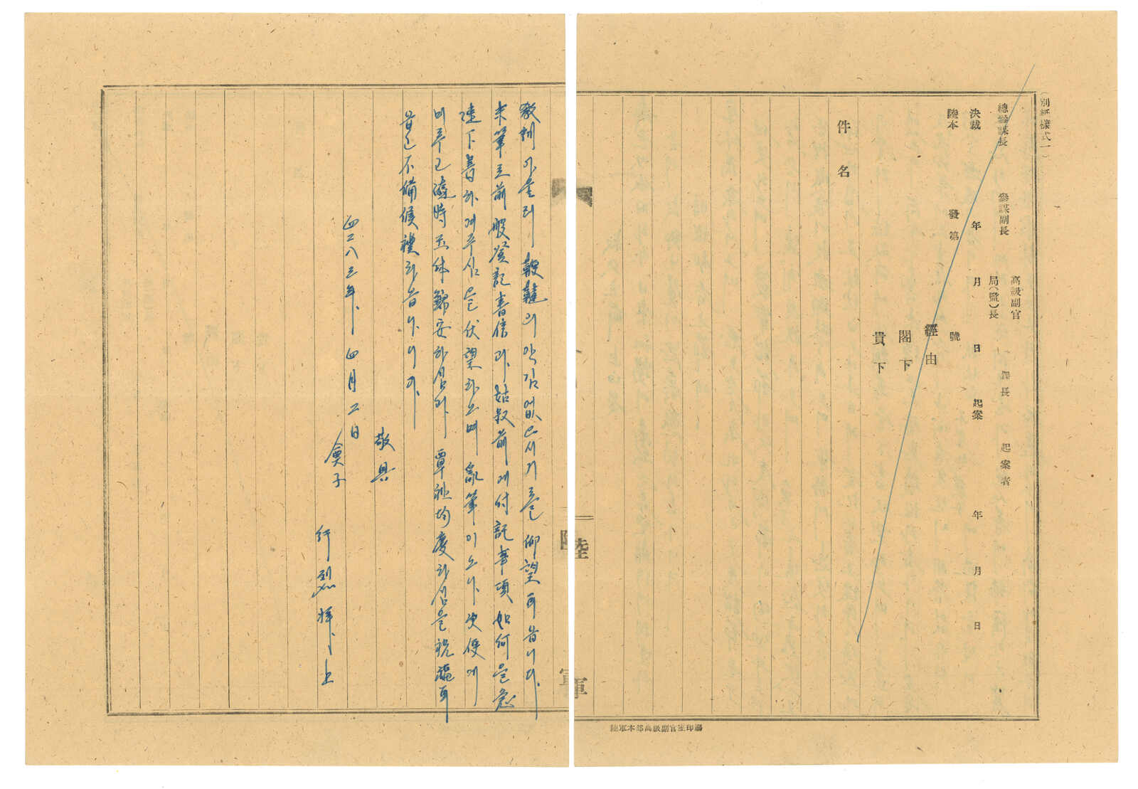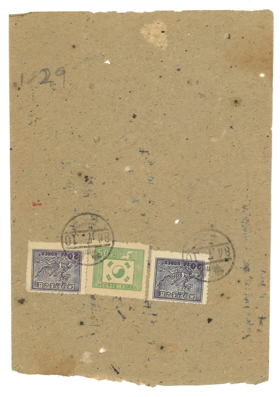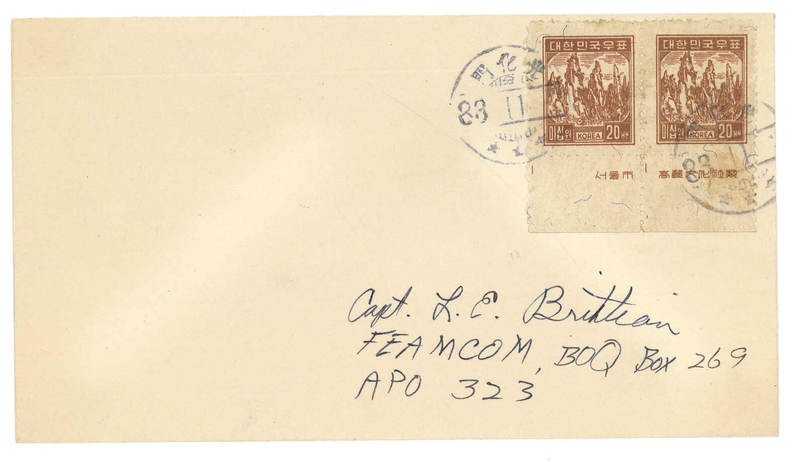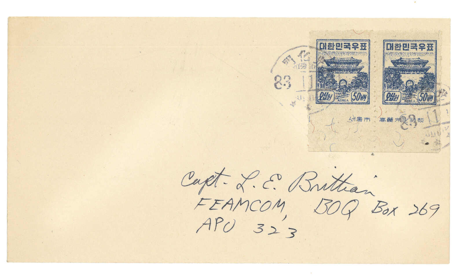 4283年(1950)11月10日美軍軍郵封,貼第一版普票南大門50圜雙連帶下廠銘,銷光化門日戳。此封由美軍中之集郵者製作,時間為重奪漢城後。(Image 1)