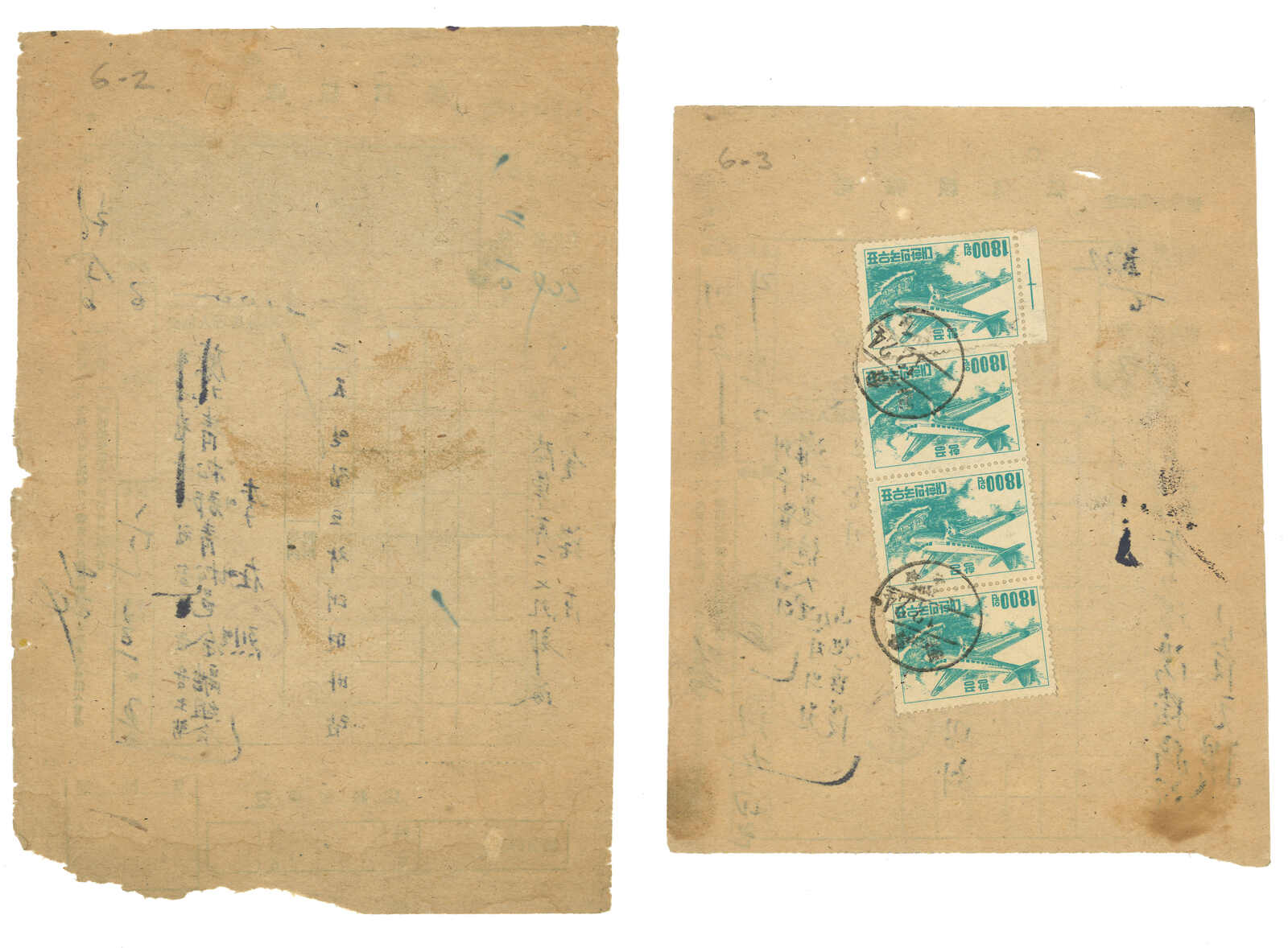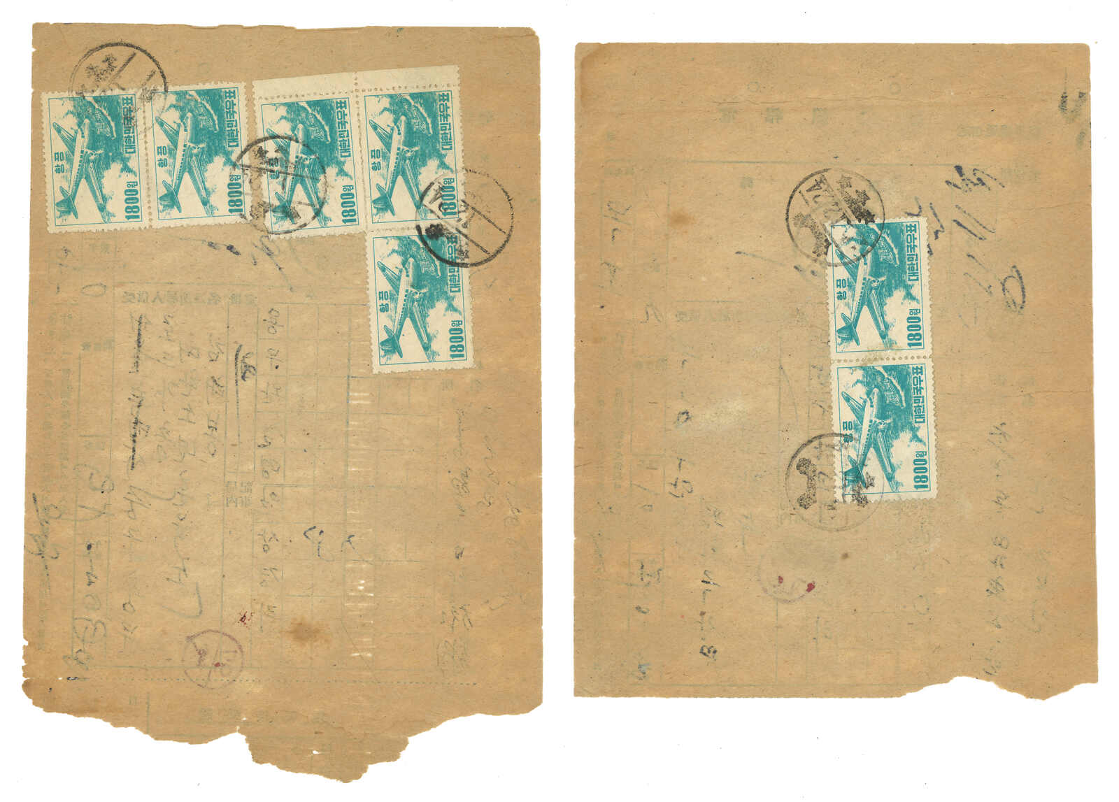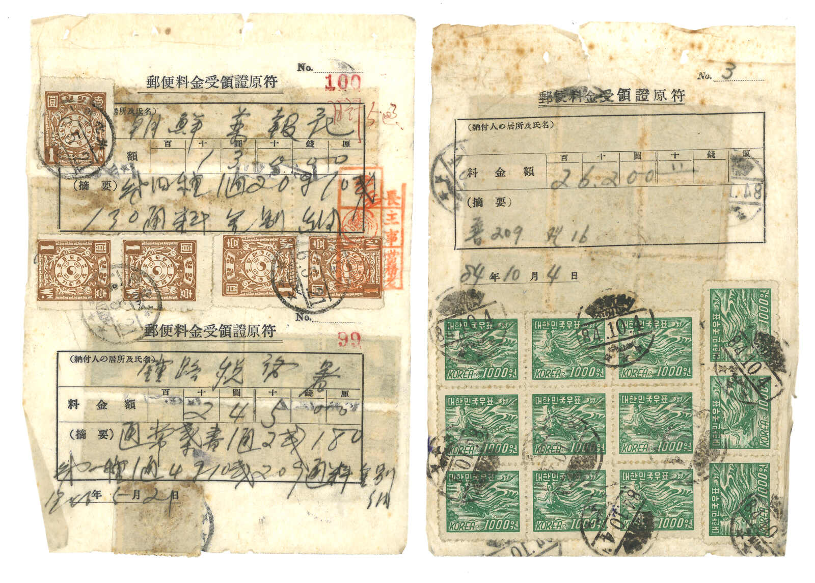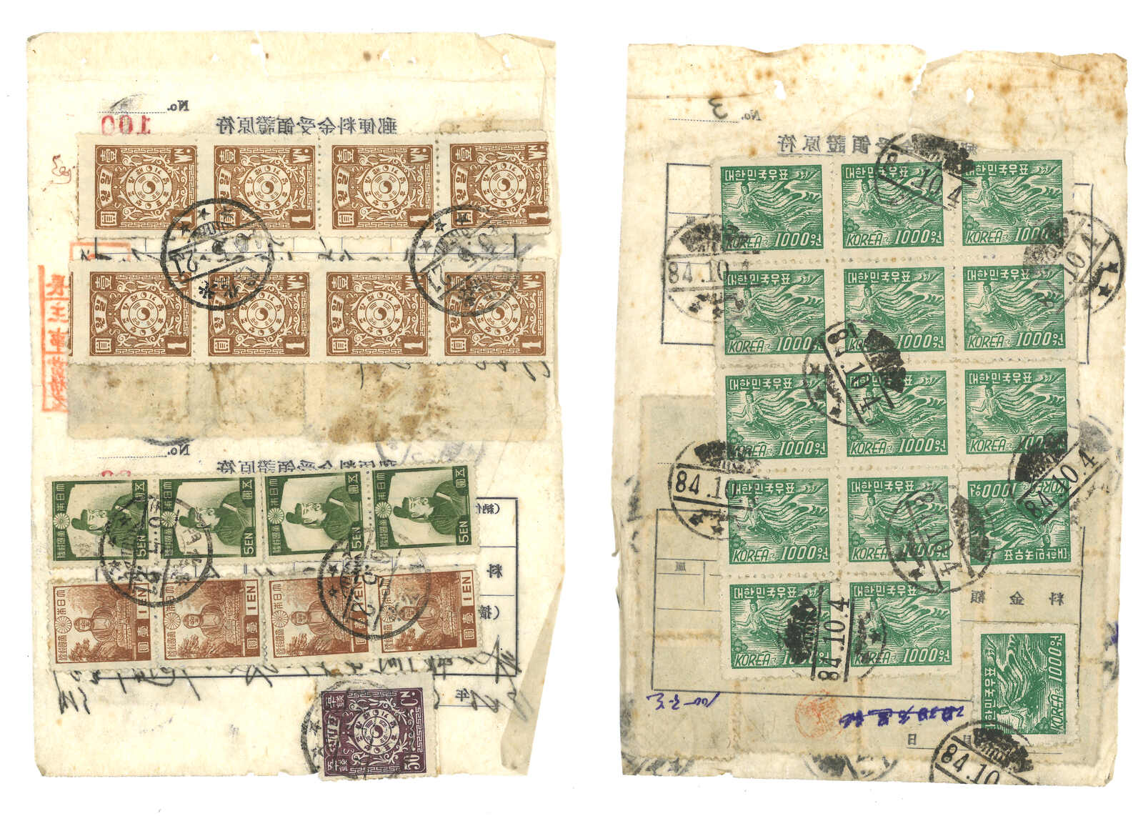 1950s a pair postal saving receips, f.w. Korean Liberation 1w and 2nd ROK definitive issue 1000w in multiple respectively.