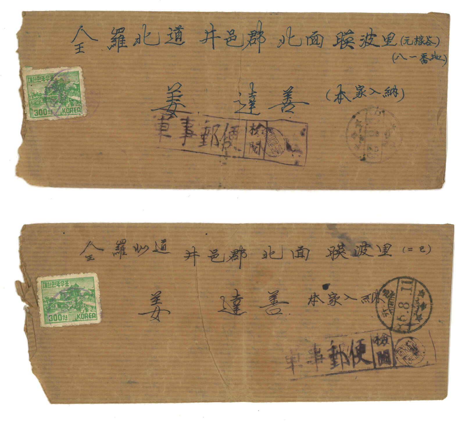 1950s a pair of Korean War censor covers to Jeonbuk State, both f.w. 2nd KOR "Won" definitve issue 300w, alongside with military censor mark and name seal of the censor.