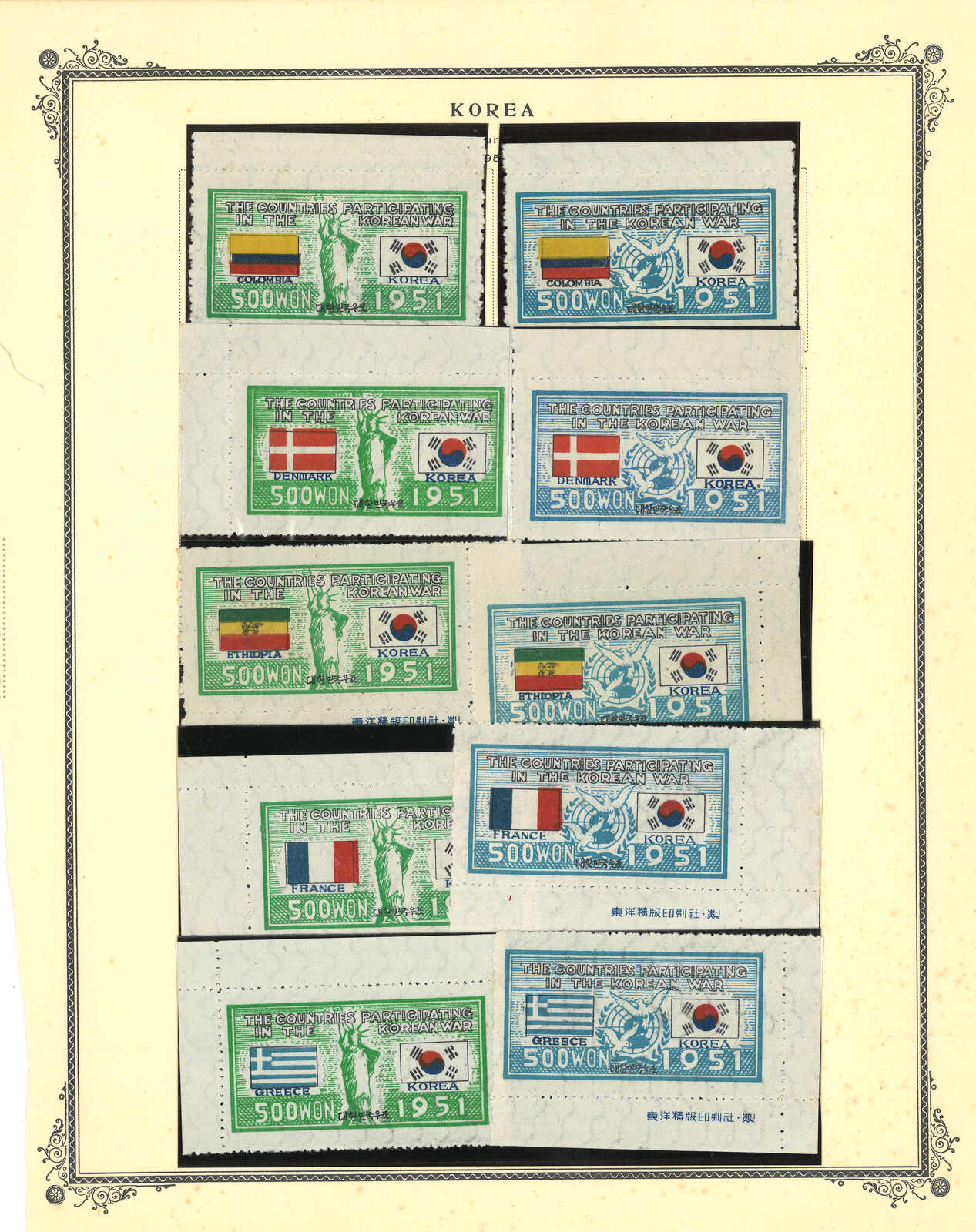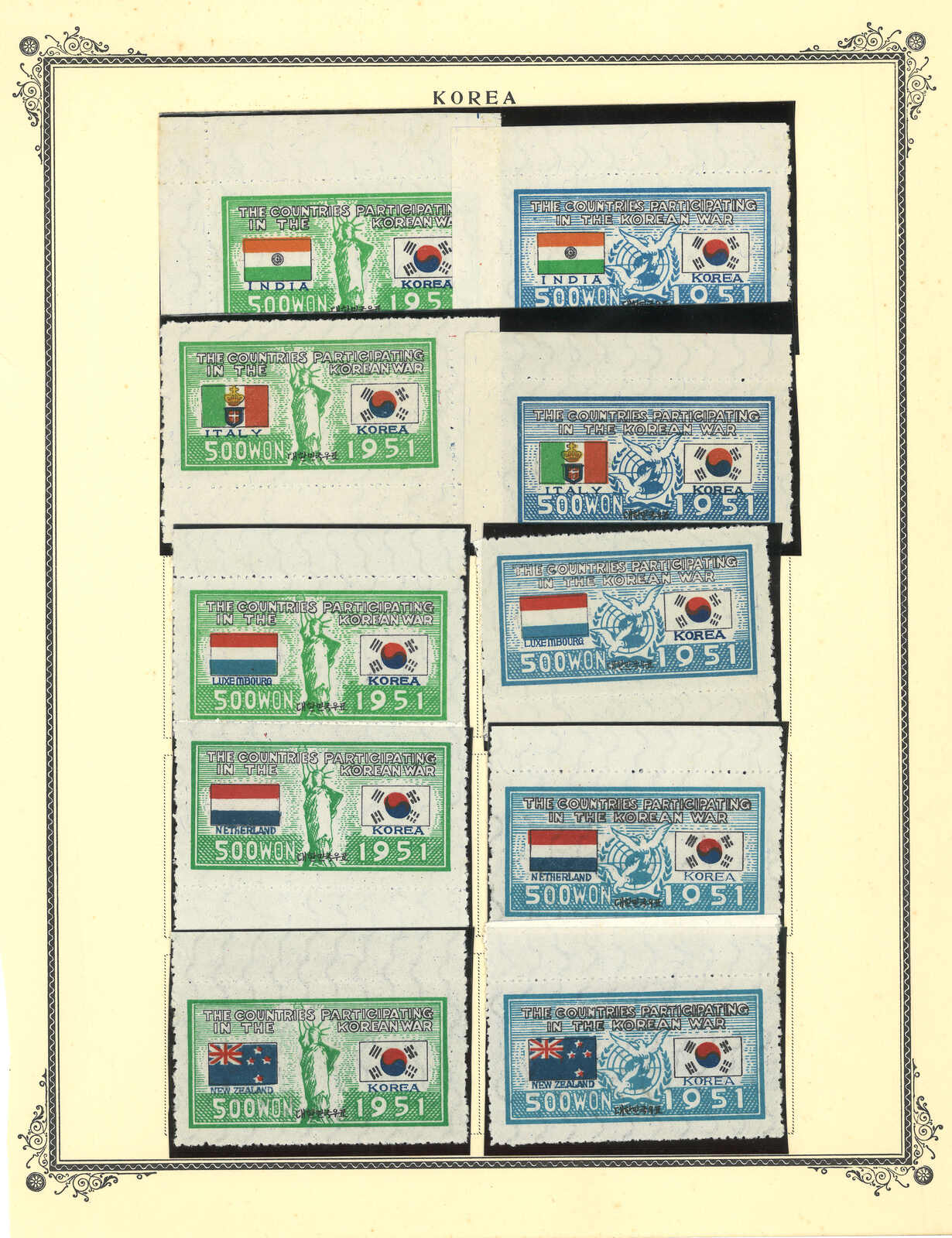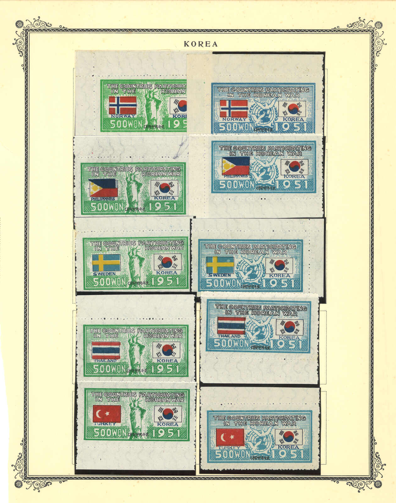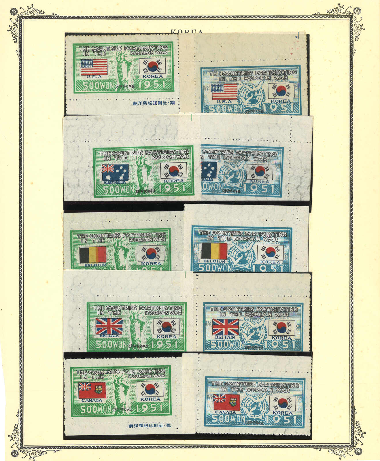 1951年一組“參與韓戰友好國家”郵票新,21個國家齊全(欠修正國旗後的意大利第三版),包括綠色及藍色票。均帶邊紙。(Image 1)