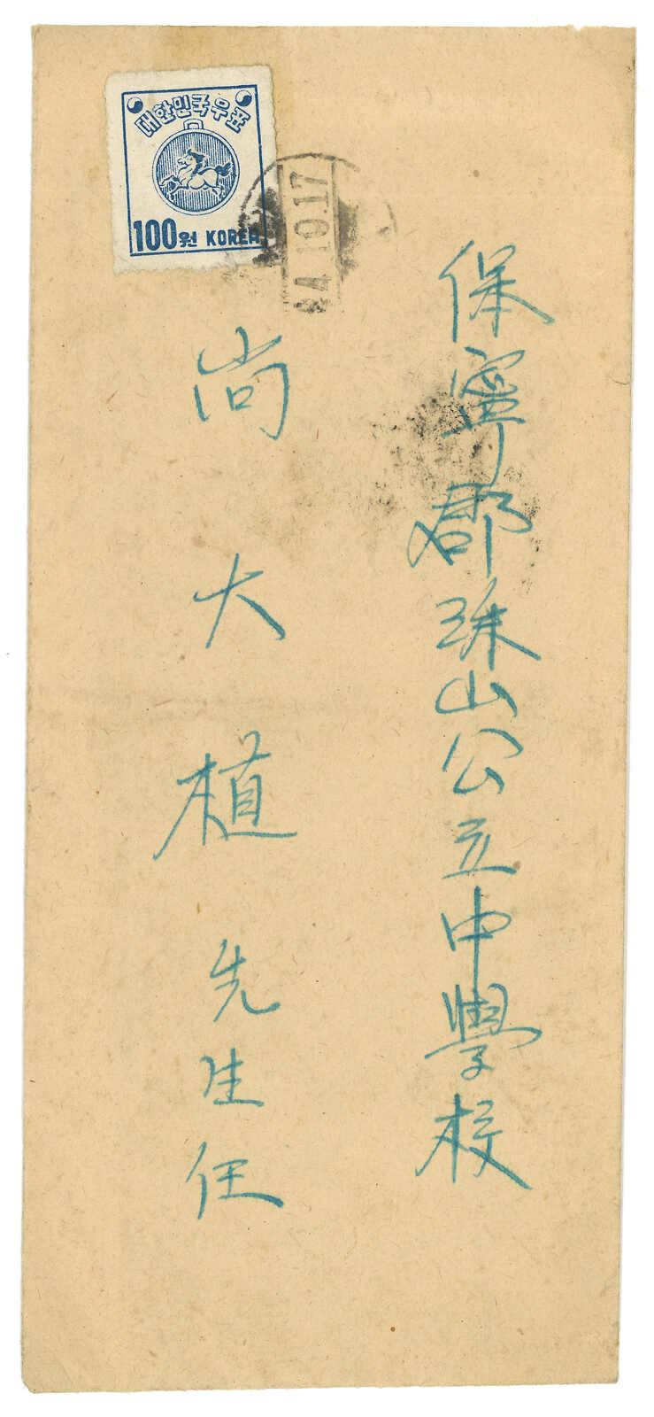 4284年(1951)10月17日扶餘寄保寧。韓戰時期一等國內封,貼Dongyang Jeongpan Printing Co版點線齒、白紙馬牌100圜,銷忠南扶餘日戳。10.20抵保寧。(Image 1)