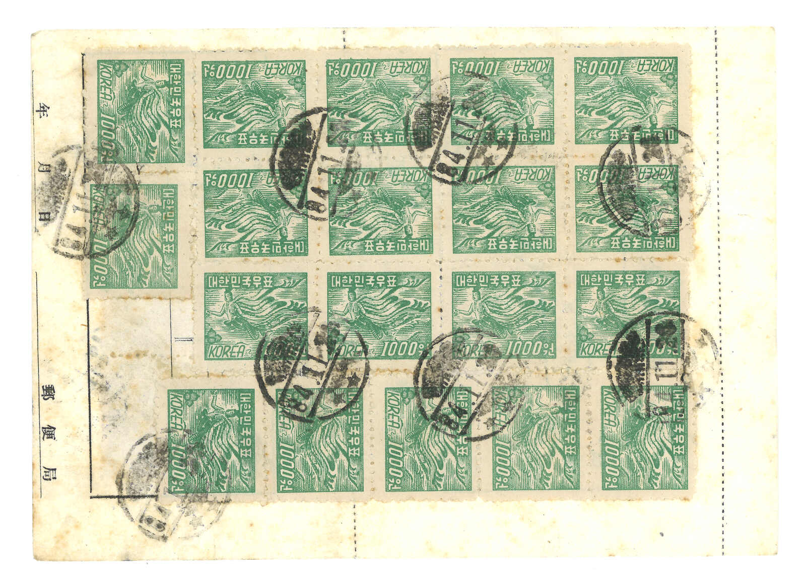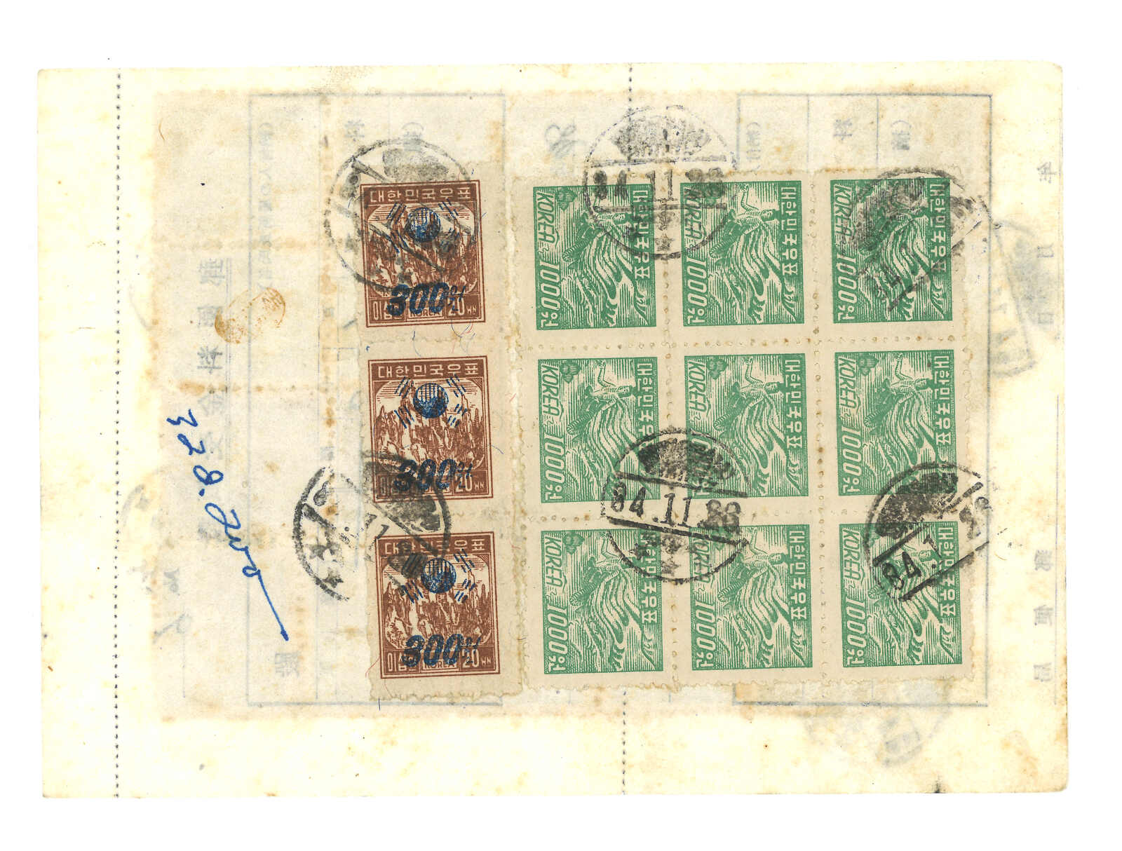Year 4284 (1951) (28 Nov) Postage receipt, f.w. Dongyang Jeongpan Printing Co Fairy perferoated 1,000w on white paper x28 + wartime surch 300w/20w in strip of 3, tied by Seoul Sinseol Dong cds. Very scarce.