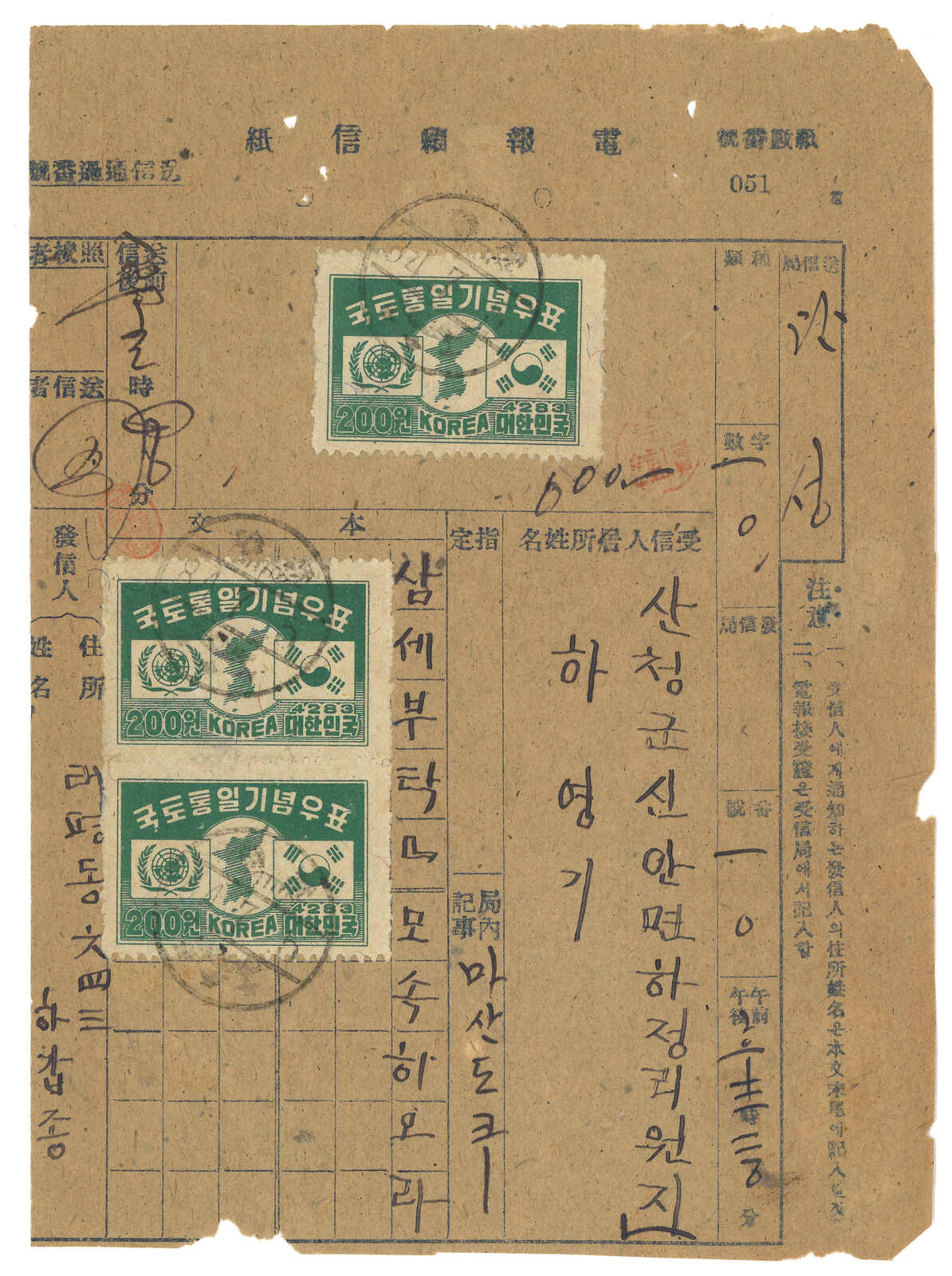 Year 4284 (1951) (5 Jul) Telegram receipt during Korean War, f.w. Unification of Land 200w in strip of 3, tied by Tongyoung cds.