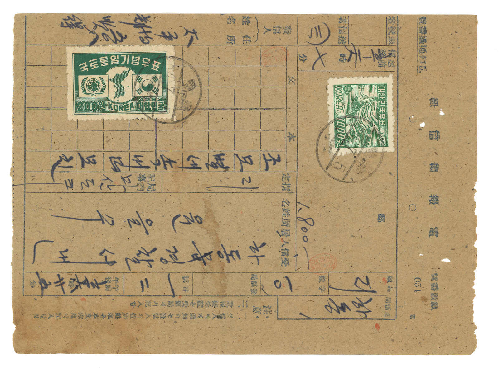 Year 4284 (1951) (10 Jul) Telegram Receipt during Korean War, f.w. Wartime surch 200w/15w in strip of 4 + Fairy 1000w + 3 other stamps for 90w, tied by Tongyoung cds.