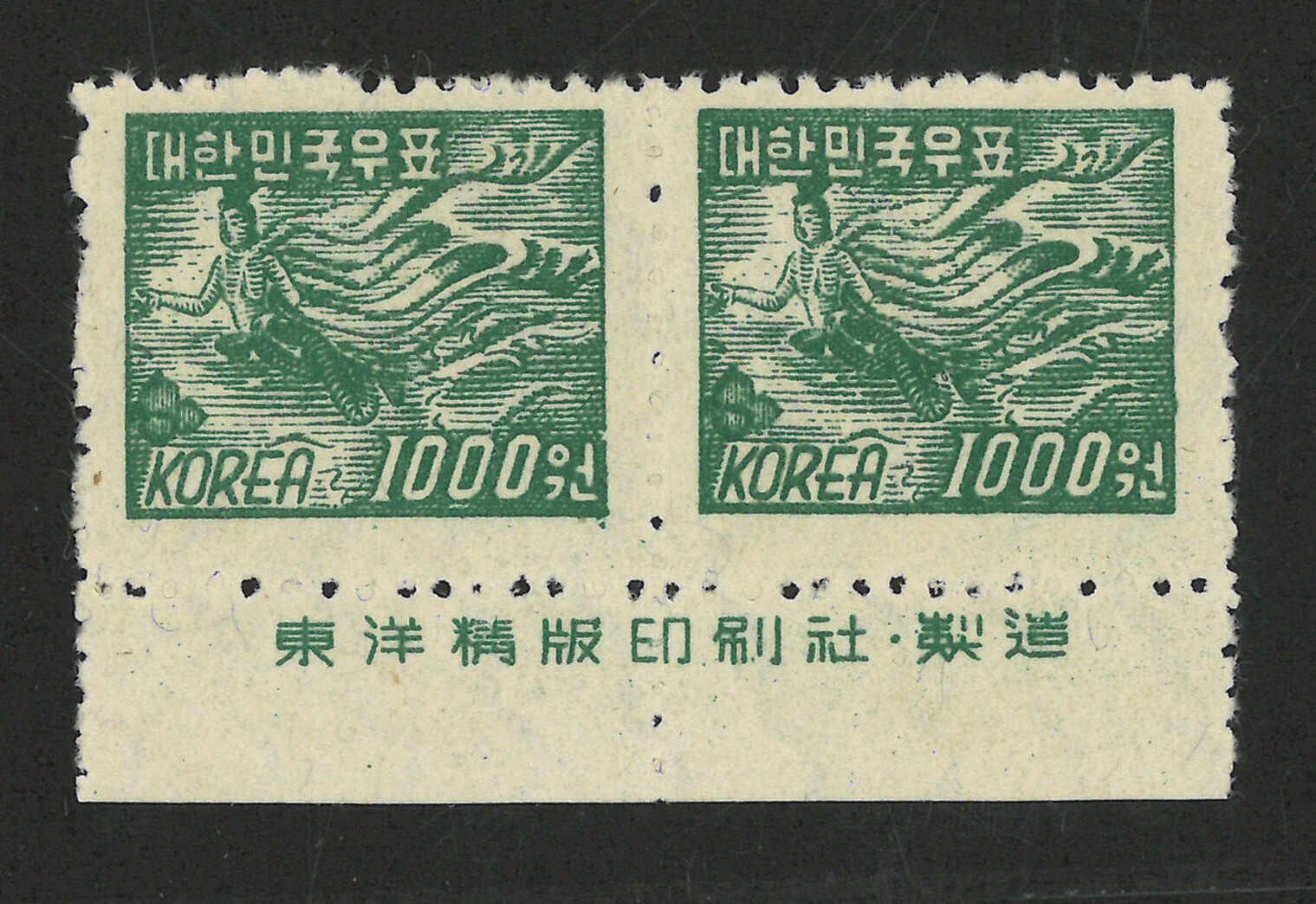 ROK 2nd definitive issue Fairy 100w in horiontal pair with bottom imprint margin. MH. Scarce.