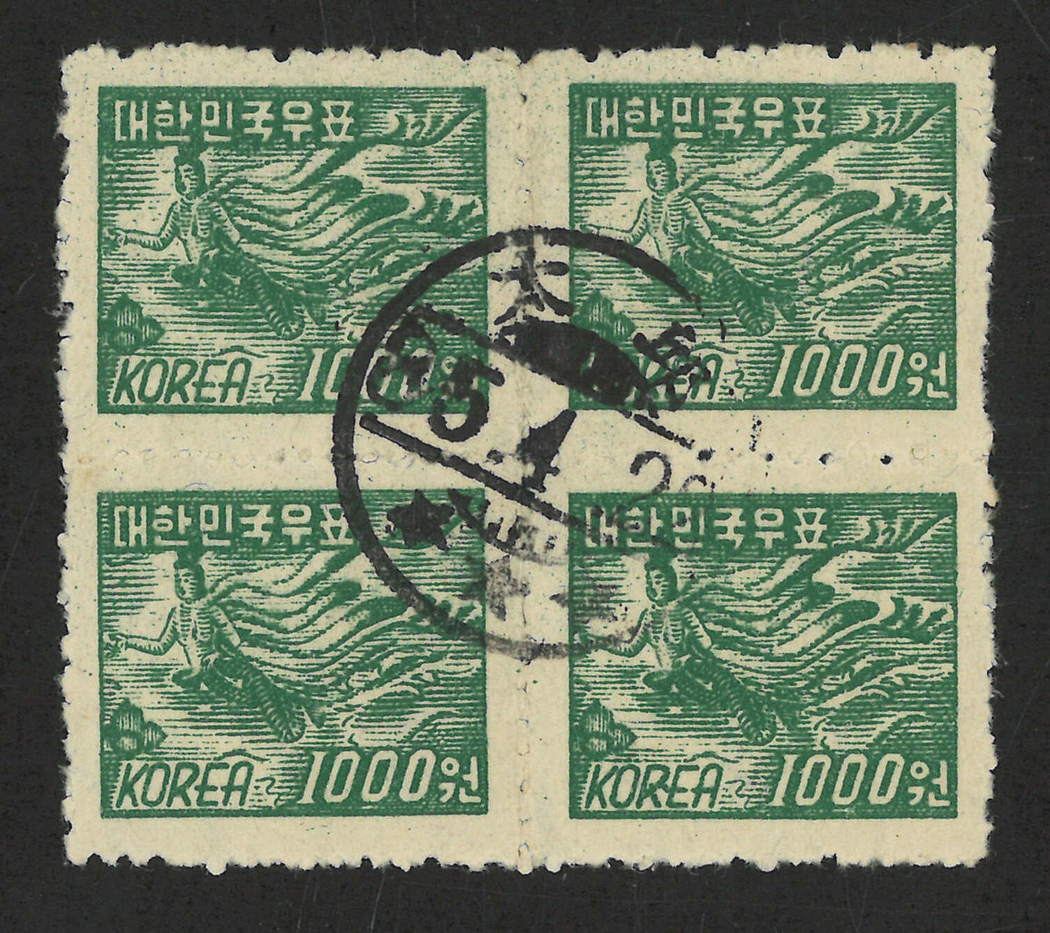 Year 4285 (1952) (22 Apr) ROK 2nd definive issue, Dongyang Printing Co., wavy line wmk Fairy 1000w in block of 4, tied by Daegu cds.