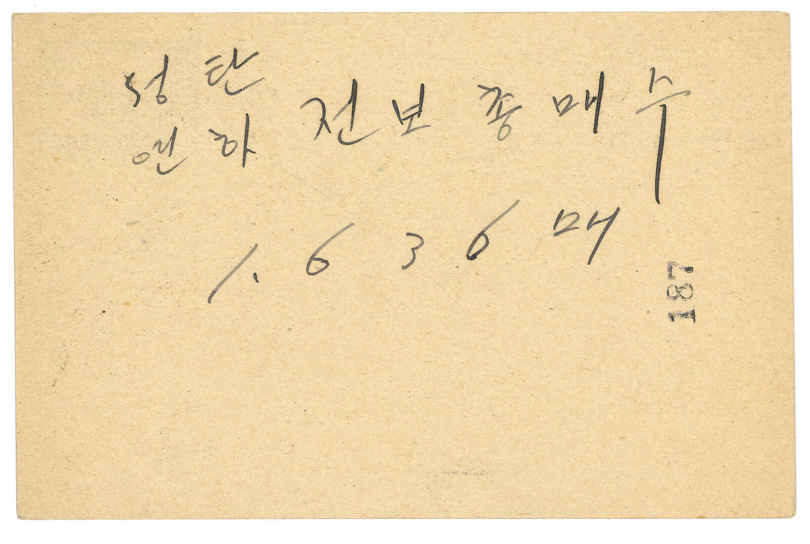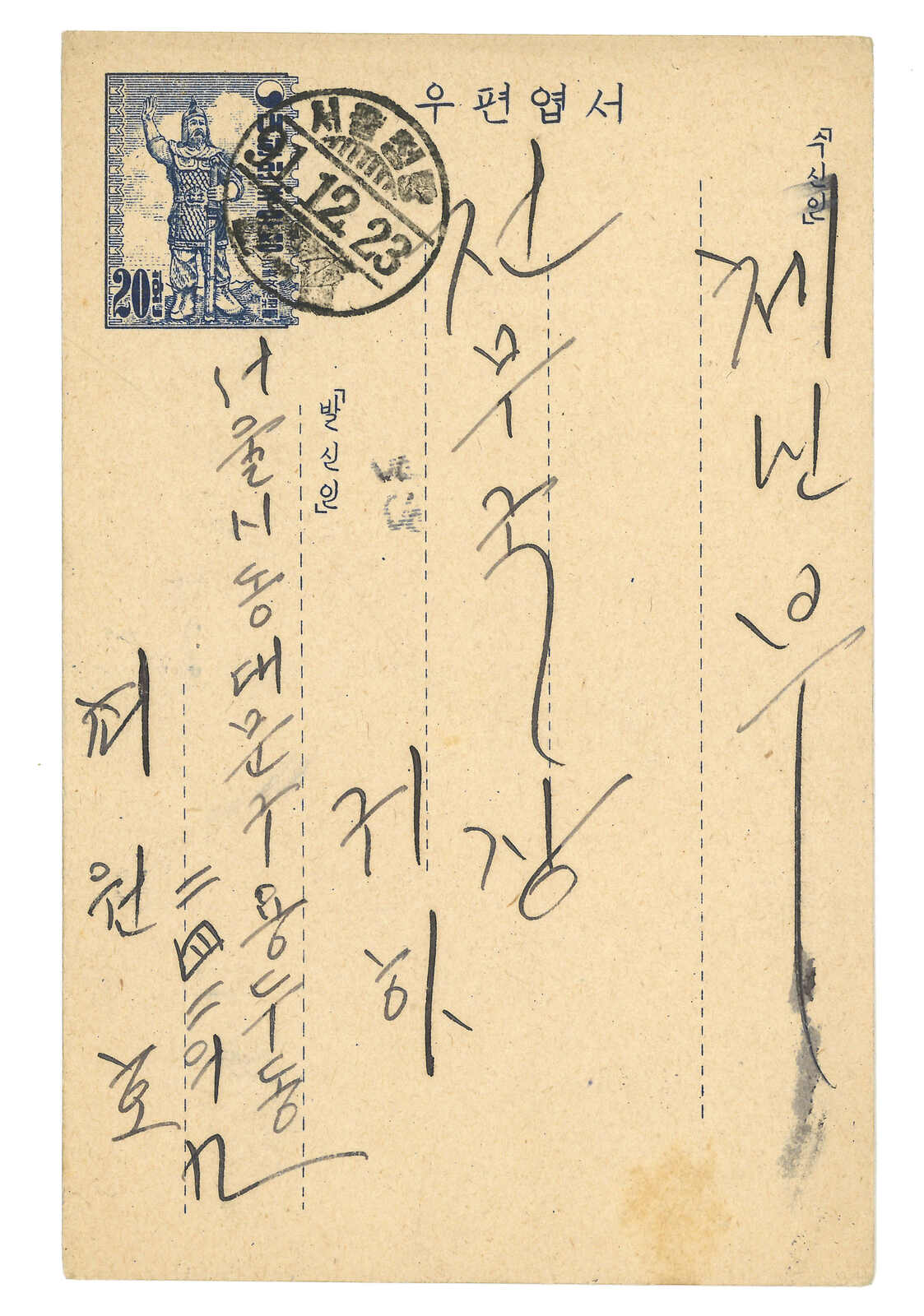 1958 (23 Dec) Unissued General Euljimundeok 20 won PSC (KDPA UPC2), tied by Seoul cds. This stationery card was withdrawn from issuance as the postcard rate was reduced to 10w emergently.
