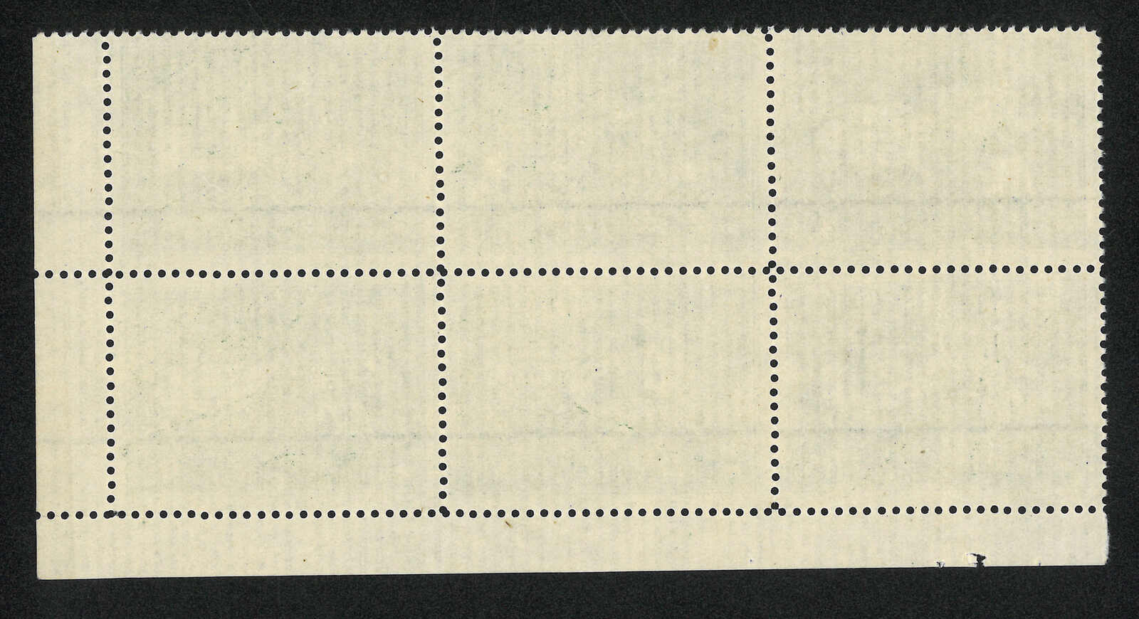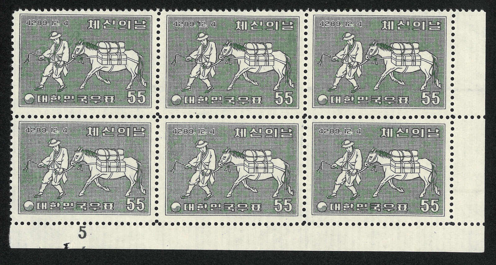 1956 Postal Day 55w in block of 6 with bottom right corner margin (KPDA 207), MNH. Bottom margin with minor damage.