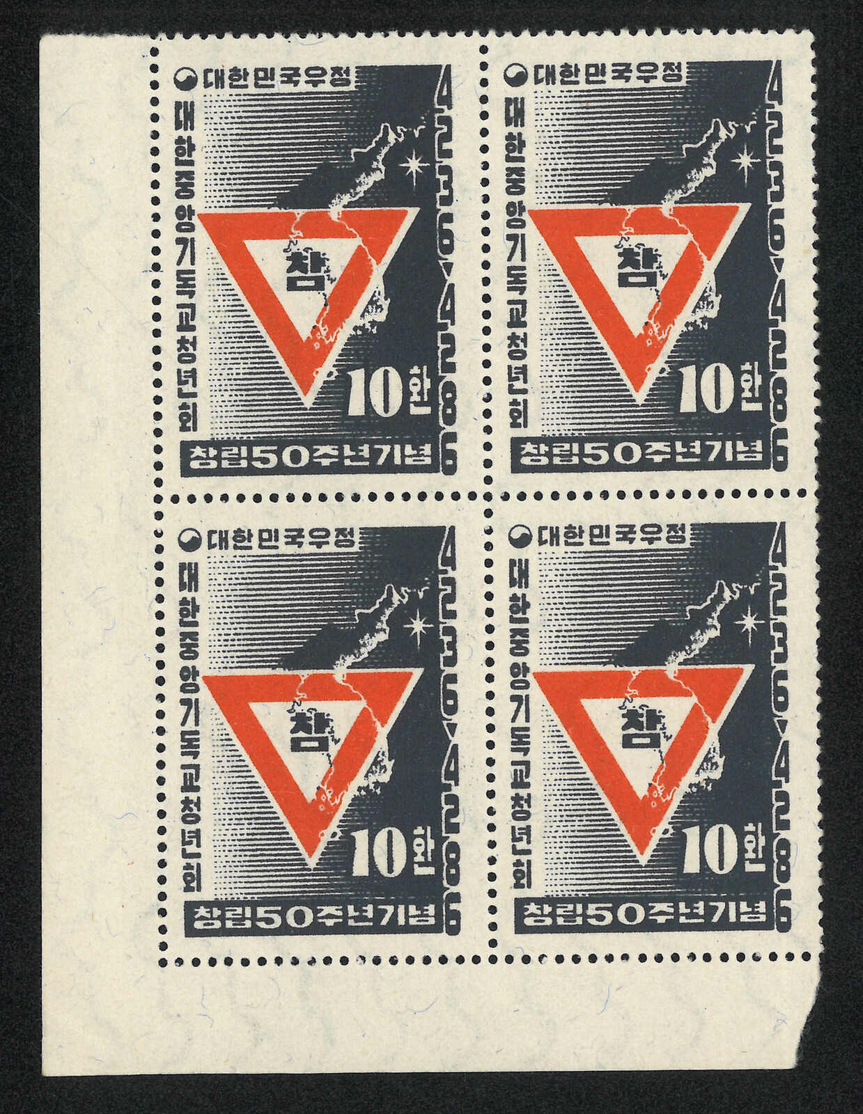 1953年韓國YMCA成立五十週年四方連新,帶左下直角邊(KPDA 151),無貼上品。(Image 1)