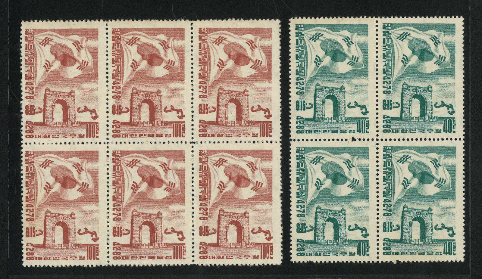 1955年韓國解放十週年方連新全(KPDA 178-179),40圜為四方連,100圜為六方連。無貼。(Image 1)