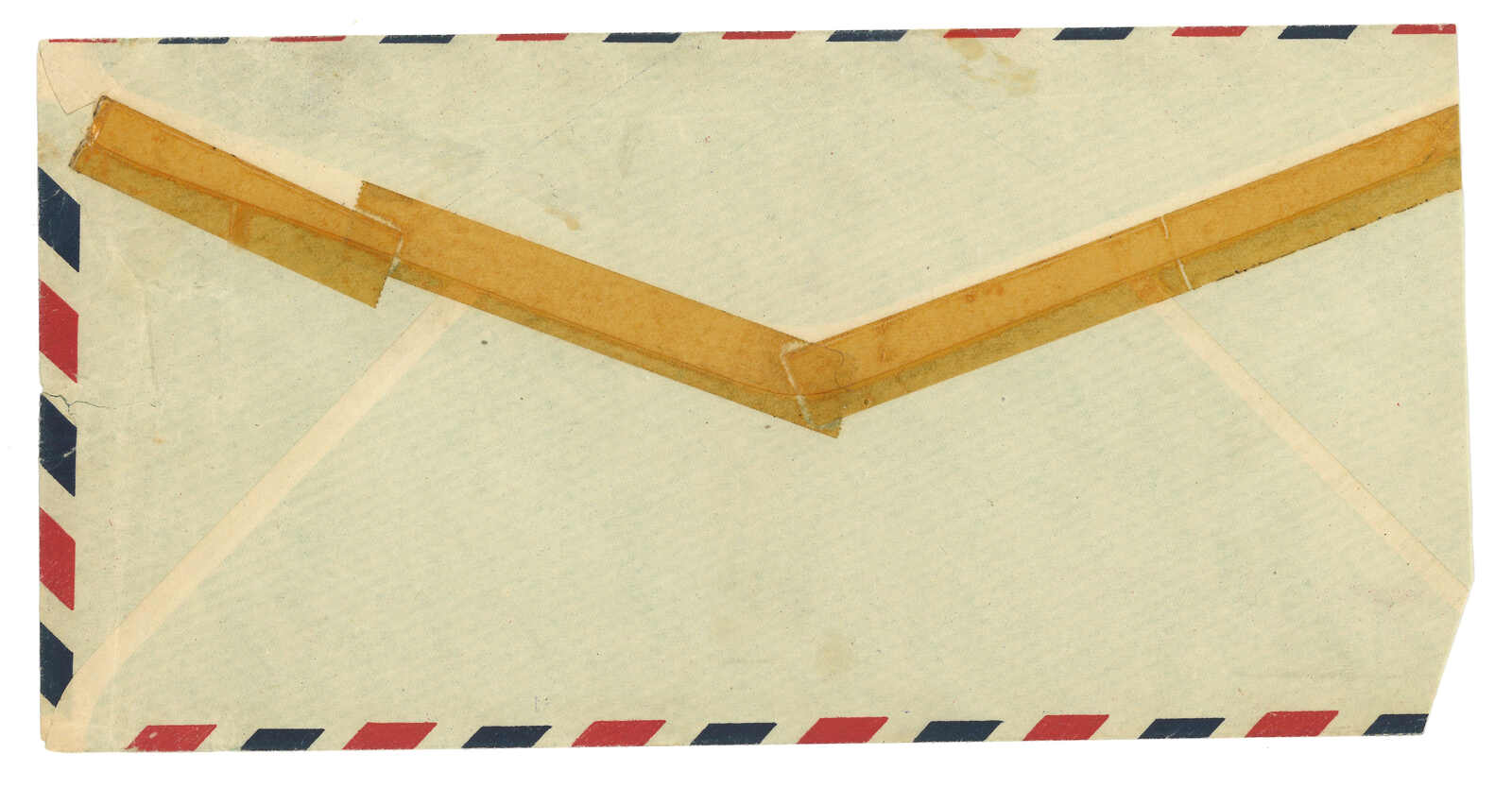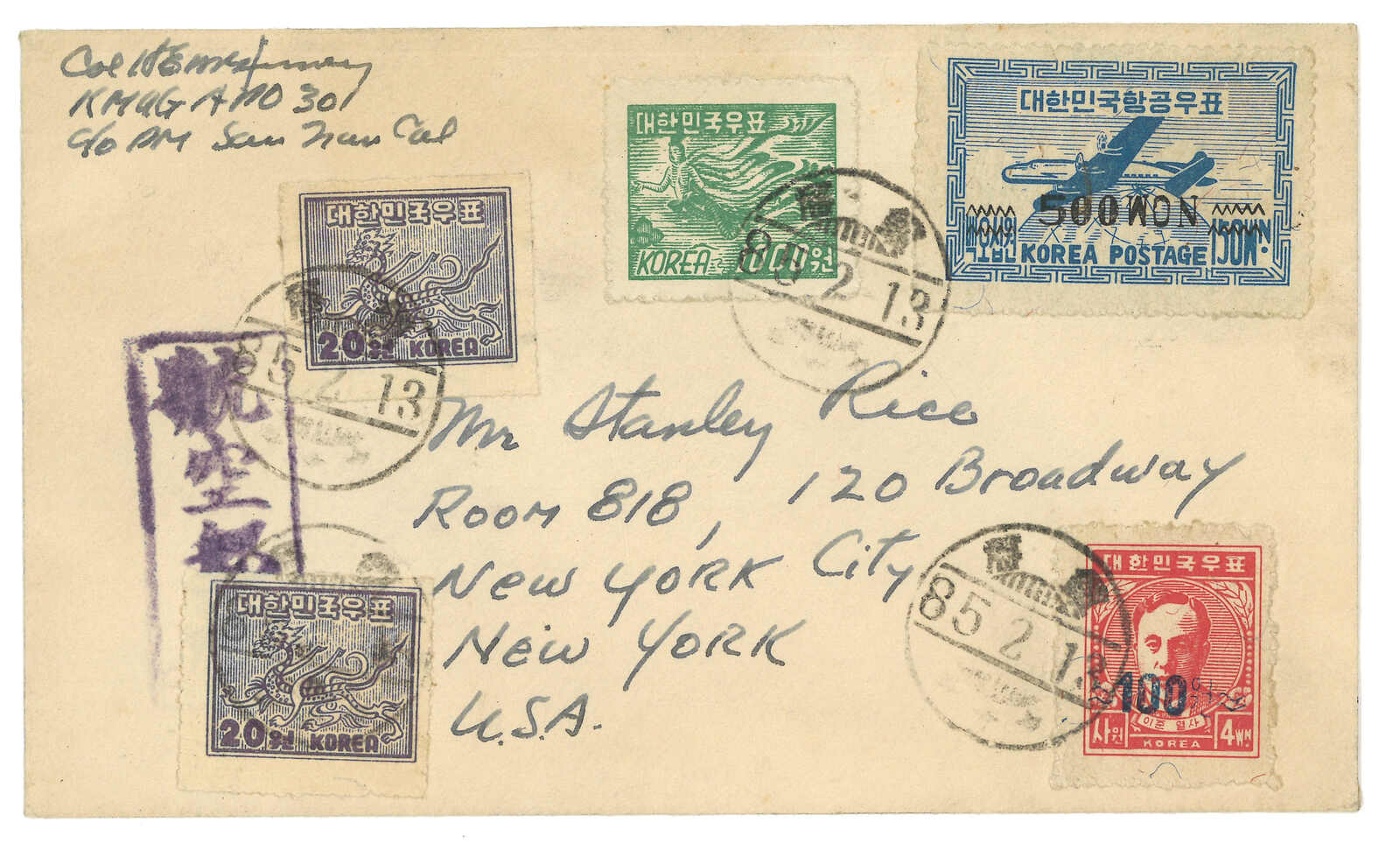 4285年(1952)2月13日鎮海寄美國。韓戰時期航空封,貼Dongyang Jeongpan Printing Co版老虎圖點線齒、白紙20圜 + 仙女1000圜 + 另外兩枚票,銷鎮海日戳。1650圜郵資例子。(Image 1)