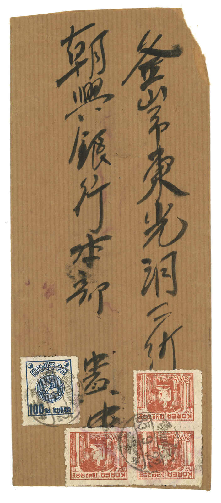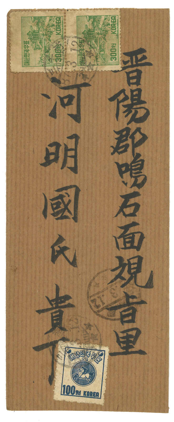 4287年(1954)3月12日三千浦寄晉陽,貼KOMSCO波浪紋水印佛國寺300圜雙連 + 馬牌100圜單枚,銷三千浦日戳。700圜100克一等印刷品郵資,該郵資於1952年9月20日至1953年1月4日生效。(Image