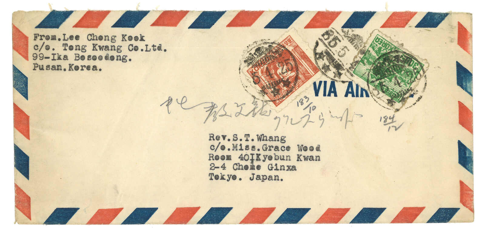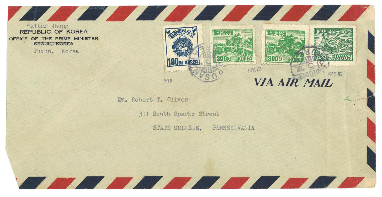 1952 Pusan (31 May) to USA. Korean Wartime airmail cover, f.w. Dongyang Jeongpan Printing Co Bulguksa wave line wmk 300w x2 + Fairy 1000w + Horse Badge 100w, overpaying 60w, tied by Pusan cds. Example of 1640w rate.