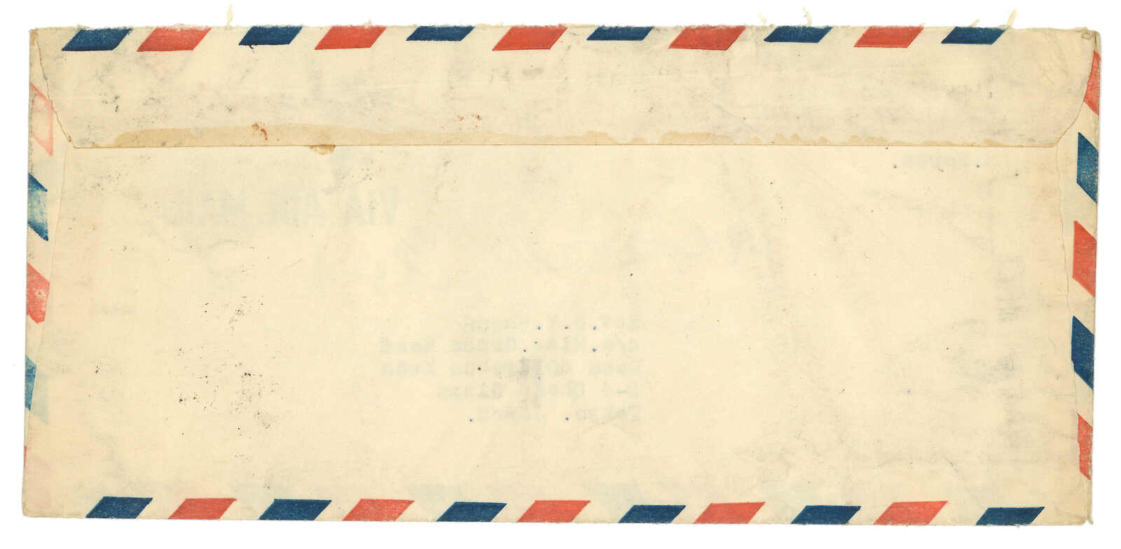 4285年(1952)9月22日寶水洞寄日本。韓戰時期航空封,貼石窟庵波浪紋水印200圜 + 佛國寺300圜,溢貼60圜,銷釜山寶水洞日戳。1951年7月10日至1952年6月20日440圜郵資例子。(Image 1)