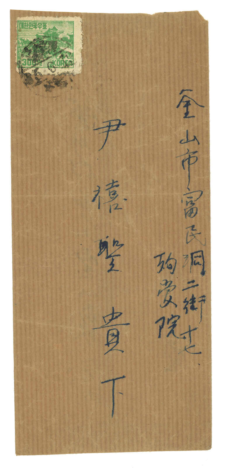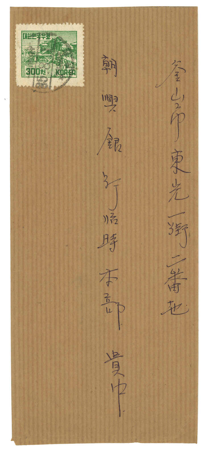 4285年(1952)8月1日韓戰戰時國內,自江華寄釜山,貼KOMSCO波浪紋水印佛國寺300圜單枚,銷京畿江華日戳。300圜20克一等郵資例子,該郵資於1951年11月6日至1952年9月19日生效。(Image 1)