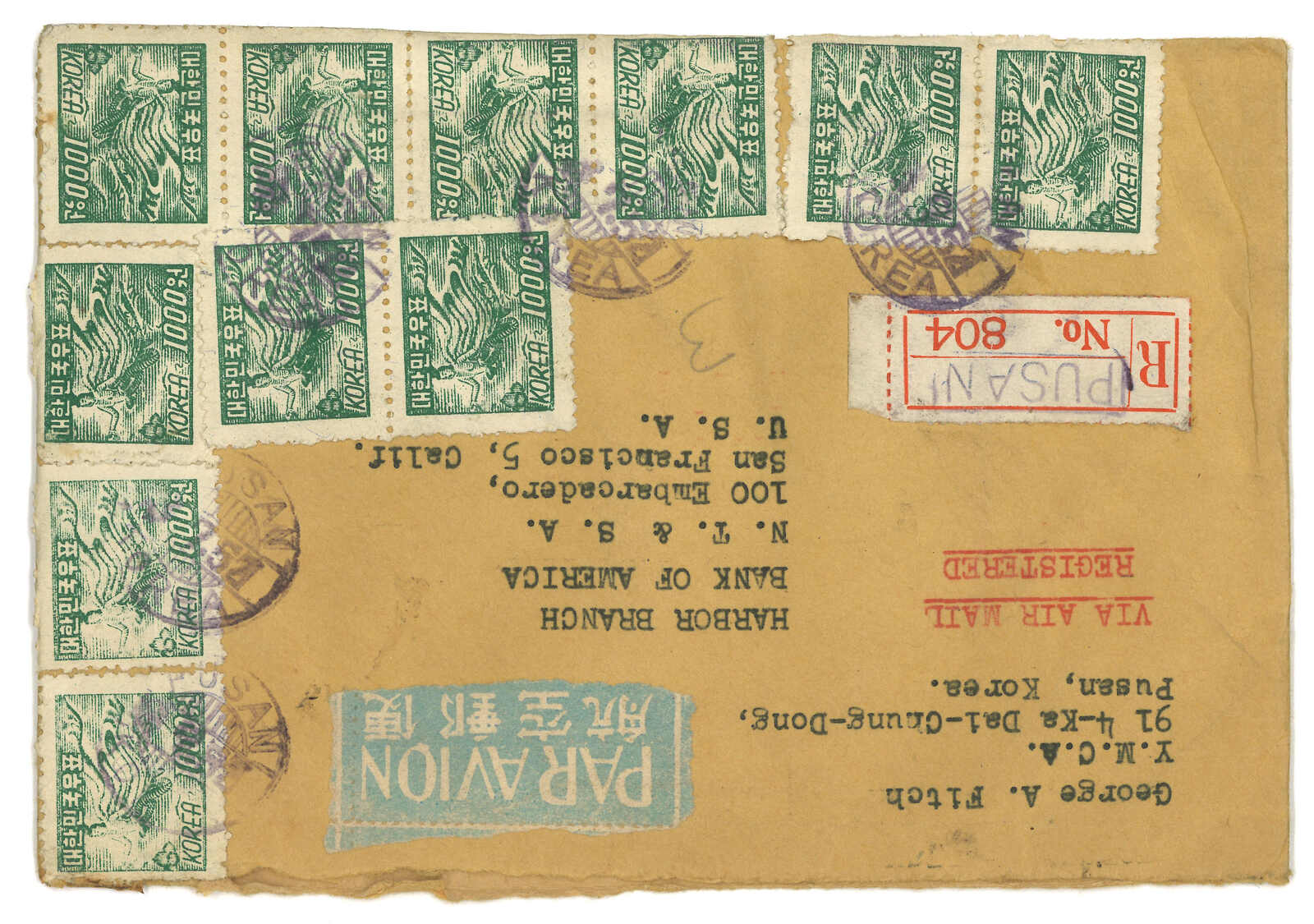 1952.7.18 釜山寄美國。韓戰時期掛號航空封,貼Dongyang Jeongpan Printing Co版波浪紋水印仙女圖1000圜十六方連 + 馬牌100圜六方連 + 佛國寺300圜,銷釜山日戳。7.24抵三藩市。(Image 1)