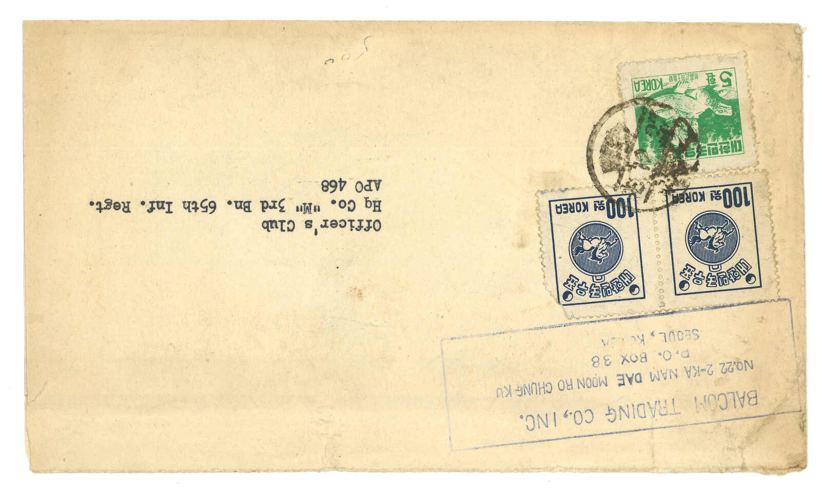 1952 Seoul local, addressing to Officer's Club, f.w. Horse Badge 100w in pair + Hwa Turtle 5 Hwan. Example of 700w for 100g first class printed matter rate, wef 20 Sep 1952 - 4 Jan 1953.