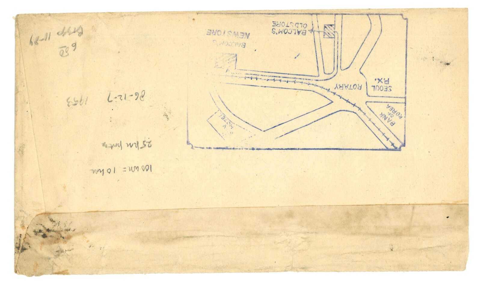4286年(1953)1月23日居昌寄釜山。韓戰時期國內封,貼KOMSCO波浪紋水印仙女圖1000圜,銷居昌日戳。1000圜20克一等郵資,該郵資於1952年9月20日至1955年1月4日生效。(Image 1)