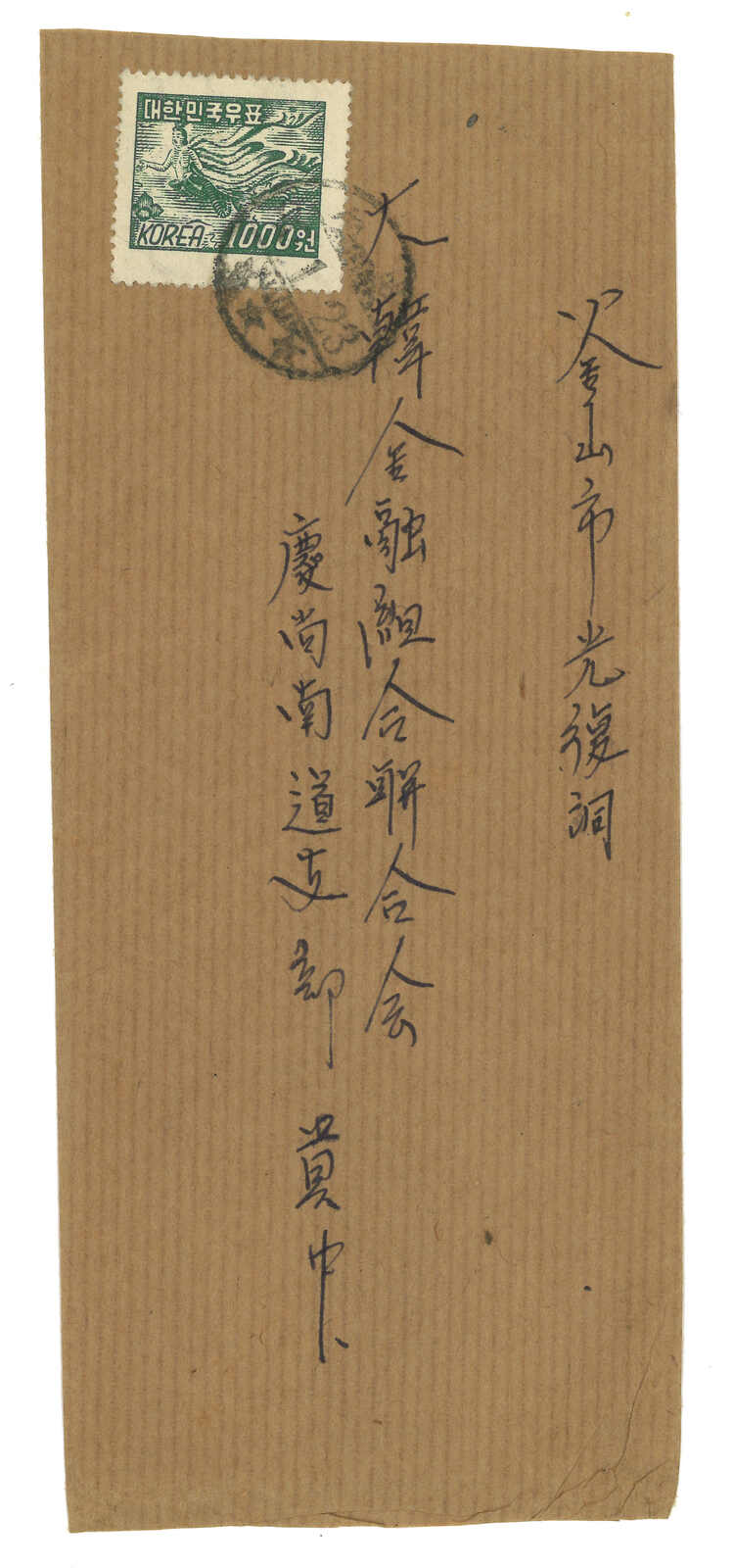 Year 4286 (1953) (23 Jan) Geochanng to Pusan. Korean Wartime domestic cover, f.w. KOMSCO wavy line wmk Fairy 1000w, tied by Geochang cds. Example of 1000w rate for 20g 1st class matter wef 20 Sep 1952 and 4 Jan 1955.