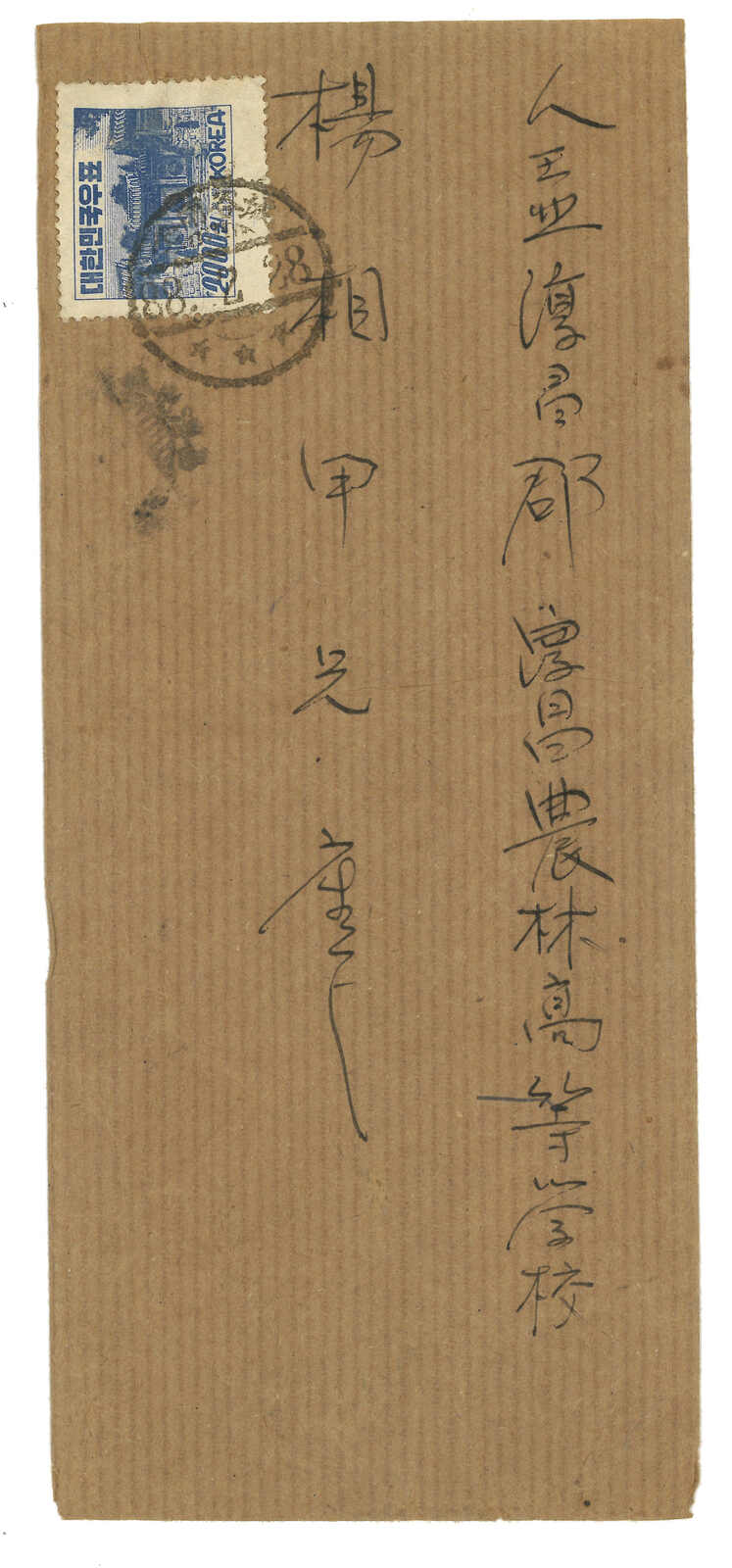 Year 4288 (1955) (28 Feb) Gokseong to Sunchang, f.w. KOMSCO wavy line wmk Chungyulsa 2000w, tied by Jeonnam Gokseong cds. 2000w rate was effective between 4 Jan 1955 and 8 Aug 1955.