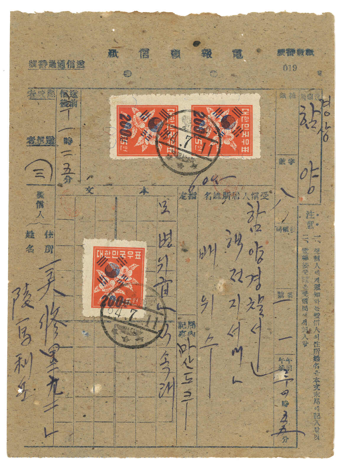 Year 4284 (1951) (11 Jul) Telegram receipt during Korean War, f.w. Wartime surch 200w/15w in strip of 3, tied by Tongyoung cds.