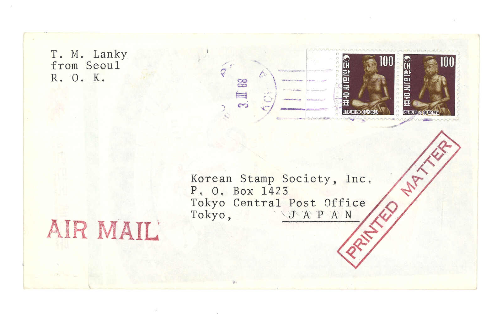 1988.3.3. 首爾寄日本,貼有稀罕少見之菩薩像100圜假票(KPDA D209),銷首爾機戳,旁鈐印刷品章。此假票的製作方法,是先把松鼠圖5圜的套印抹去,再把菩薩像100圜的圖案印上。這批假票由郵商售予集郵者。實寄者相當少見。(Image 1) (Image 2)