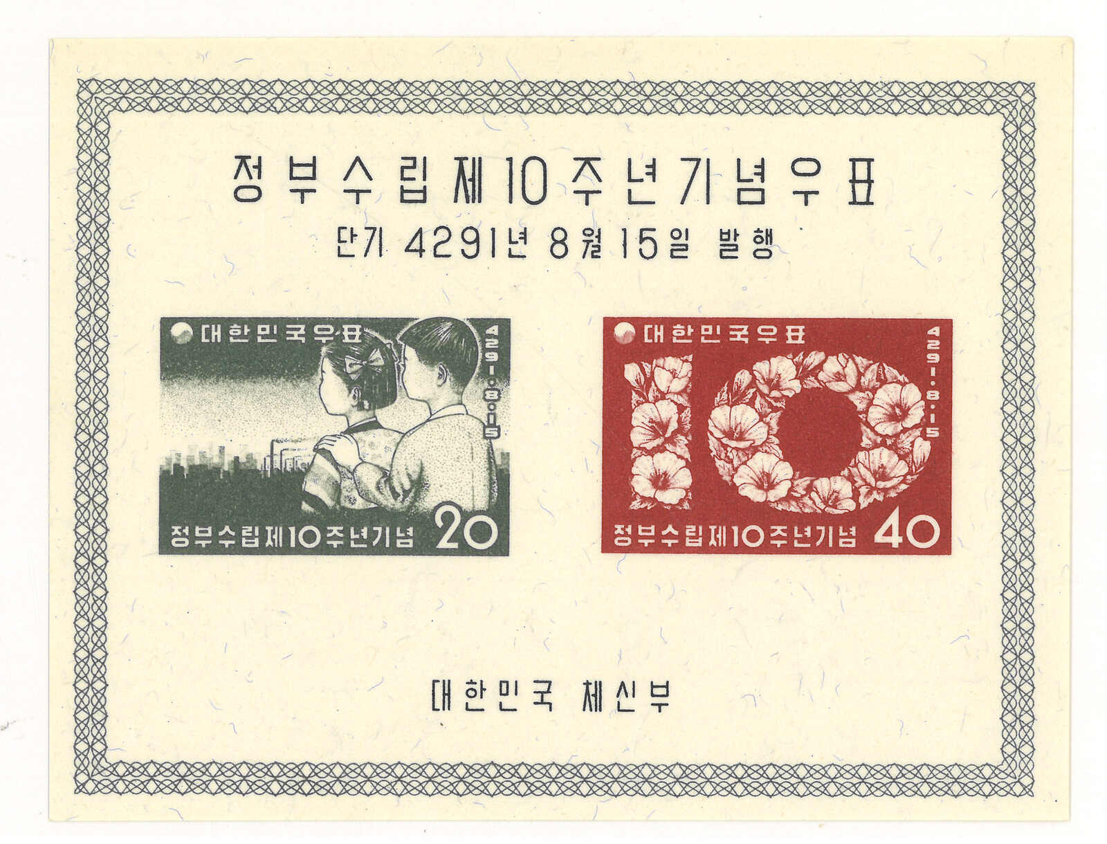 1958大韓民國成立十週年小型張新(KPDA 255a),無貼上品。(Image 1)