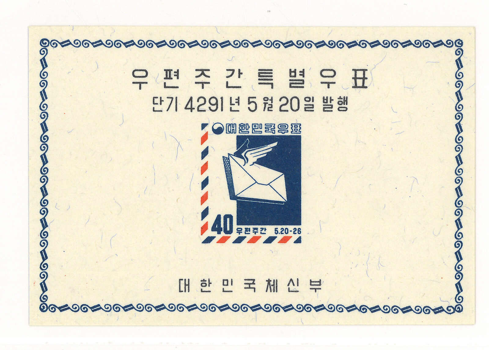 1958年第二郵政週小型新張(KPDA 253a),無貼上品。此小型張發行僅兩千張,韓國小型張之大珍品。(Image 1)