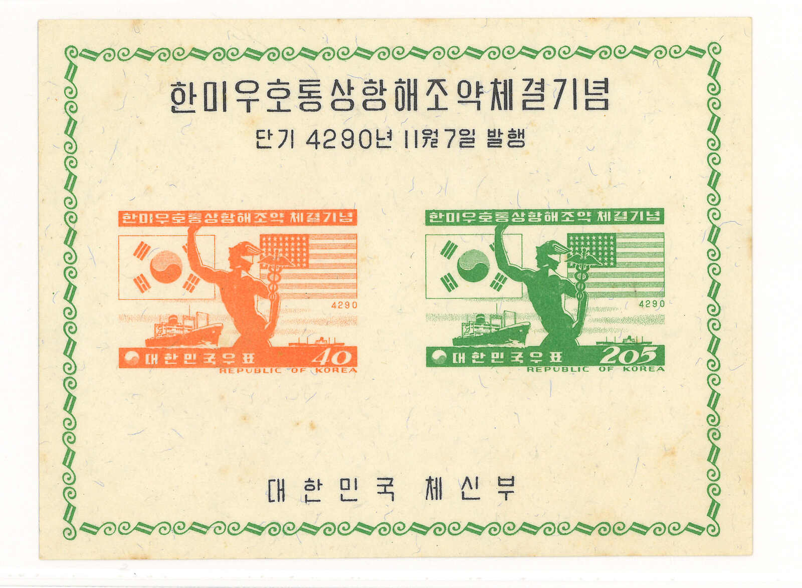 2875 image1957 The Treaty of Friendship Commerce and Navigation between Korea and USA S/S (KPDA 243a), MNH. Very Fine. The issuance of this S/S was only 20,000. A rarity.