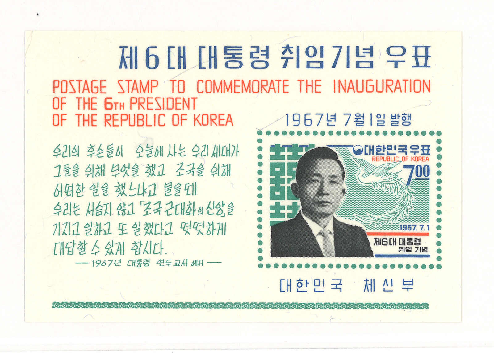 1967年韓國第六任總統就職小型張新(KPDA 557a),無貼上品。(Image 1)