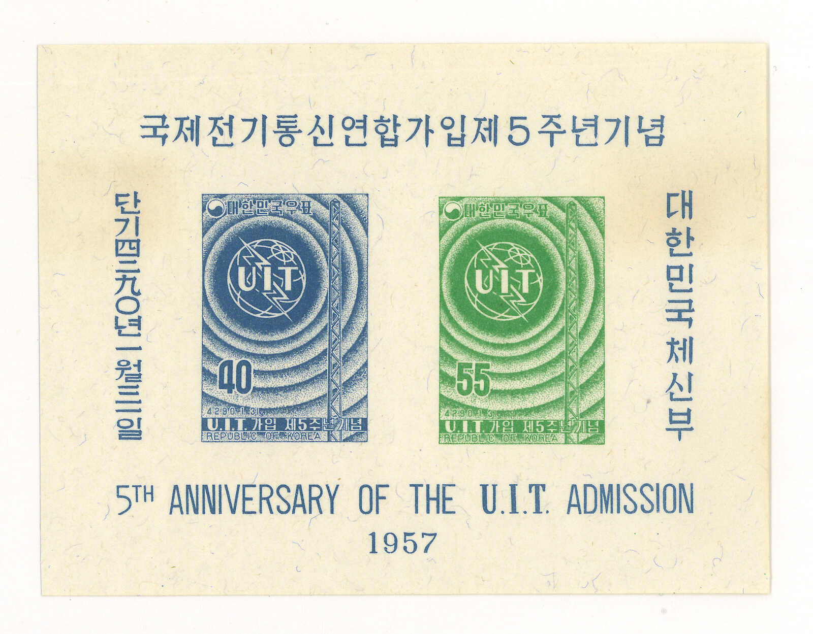 2873 image1957 5th Anniv of Joining the ITU presentation sheet (KPDA C70), MNH with minor toning. The issuance of this presentation sheet was only 1,000. A rarity.