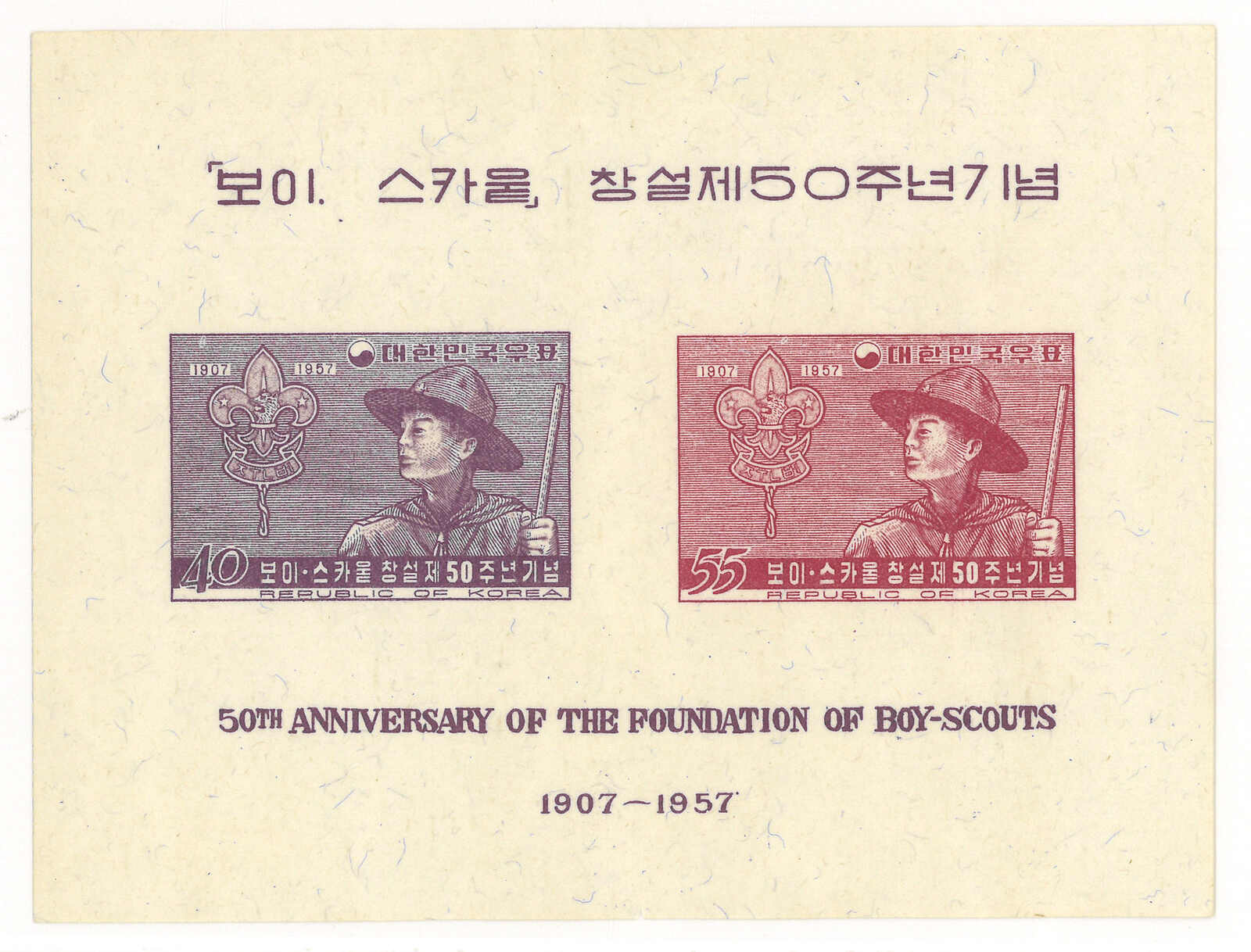 2874 image1957 50th Anniv of Boy Scout Movement presentation sheet (KPDA C71), MNH. The issuance of this presentation sheet was only 1,000. A rarity.