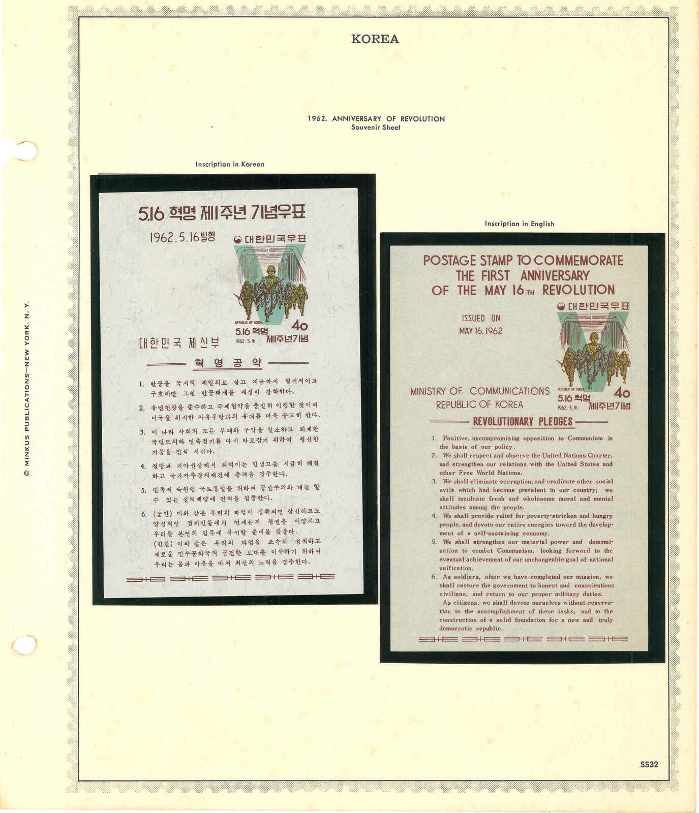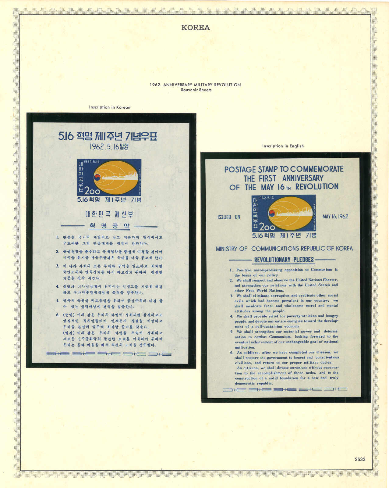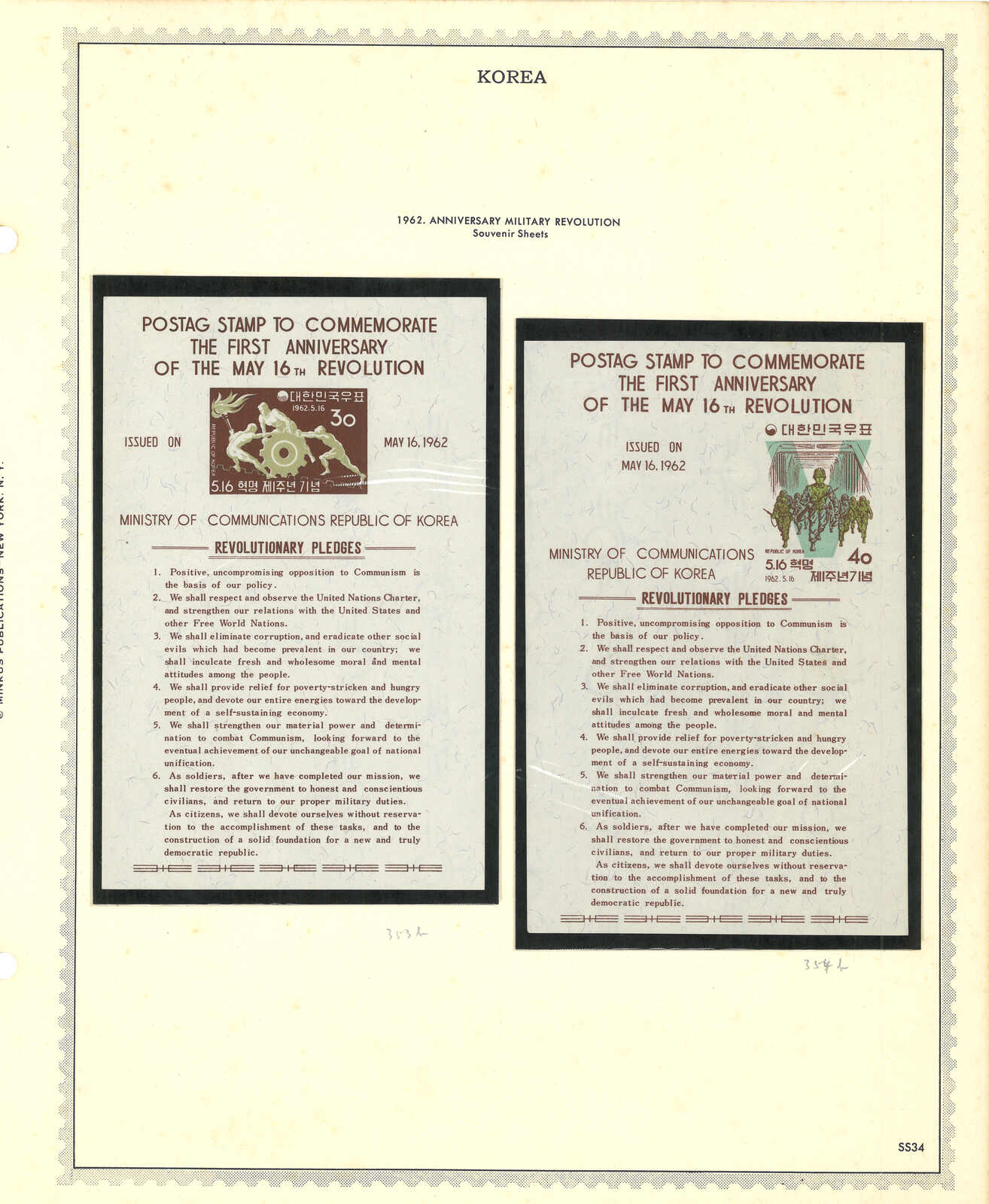 1962年消滅霍亂及五一六革命一週年小型張新(KPDA 323a, 326-328a),後者包括英文及韓文張。無貼。(Image 1) (Image 2) (Image 3)