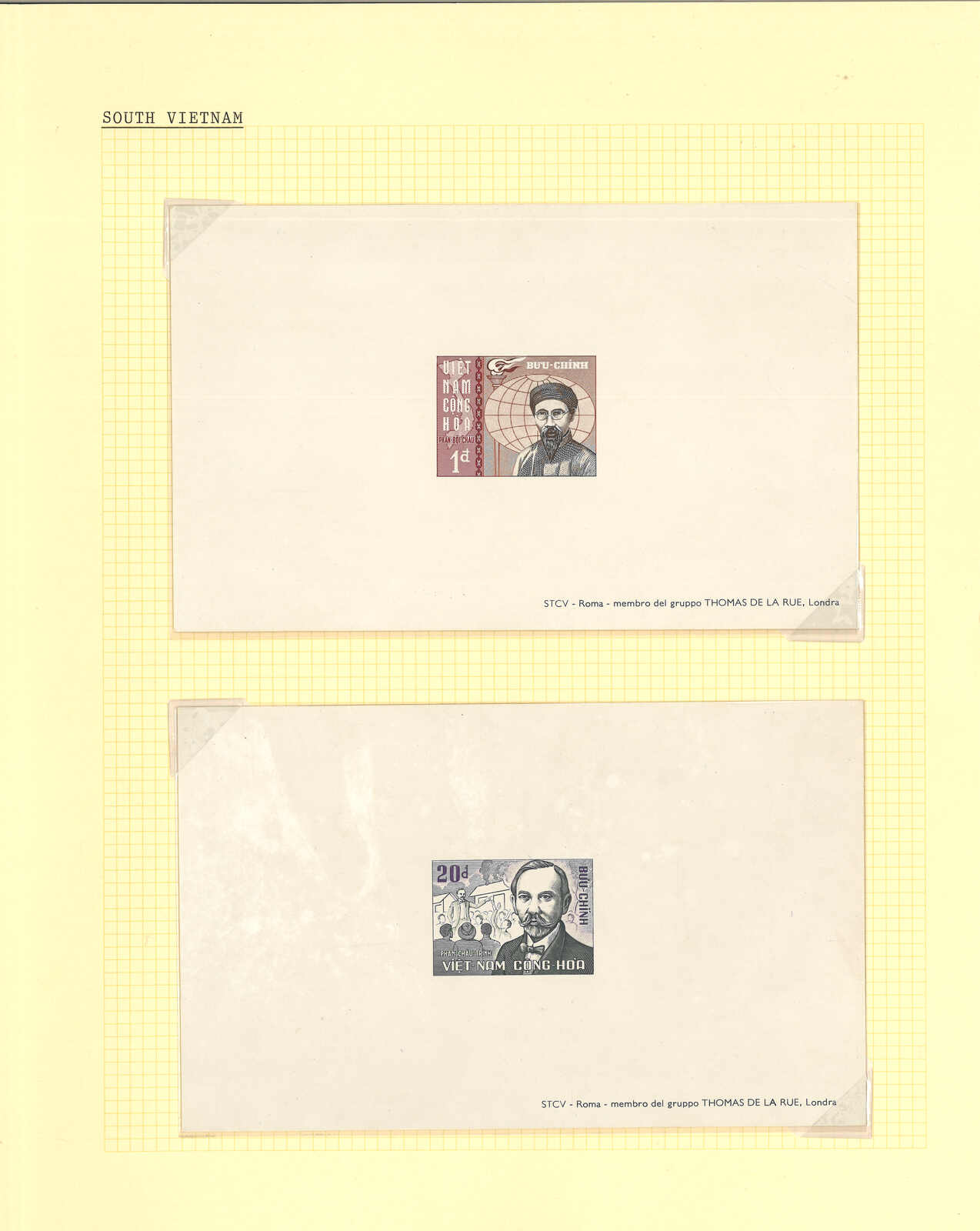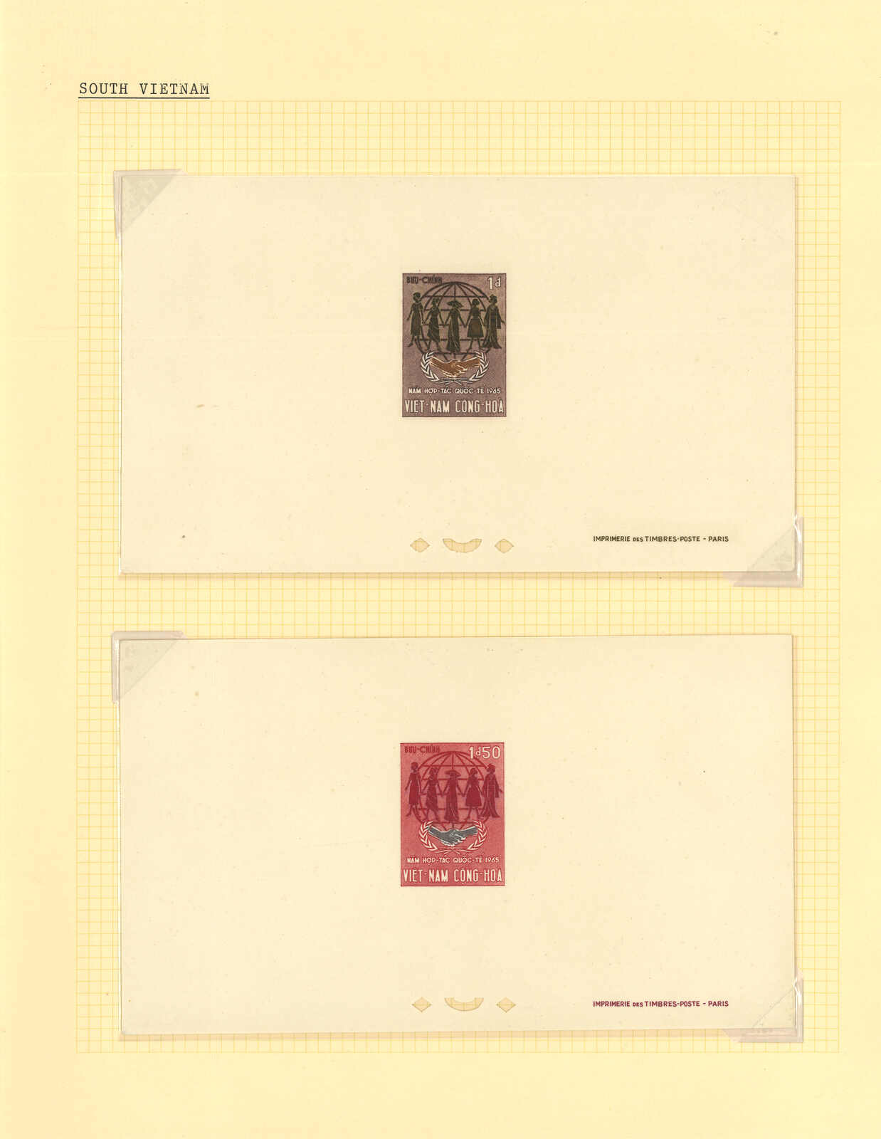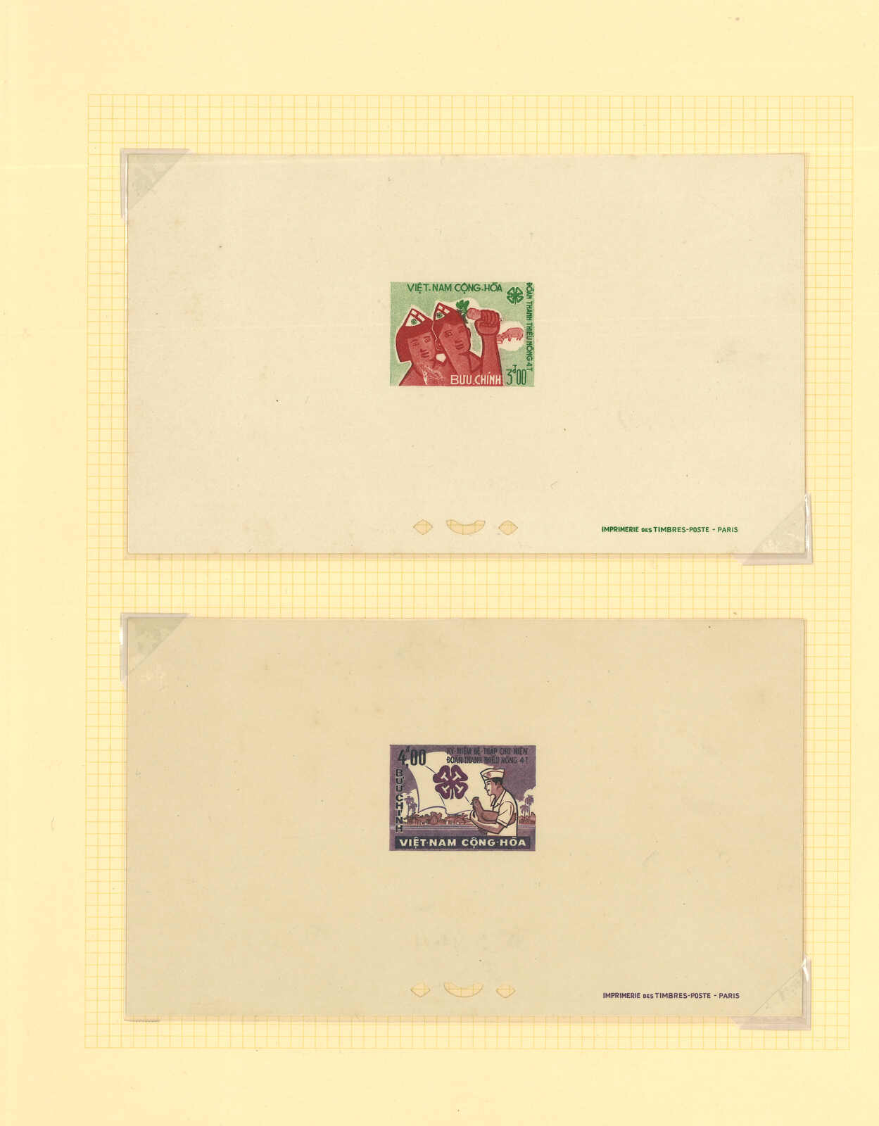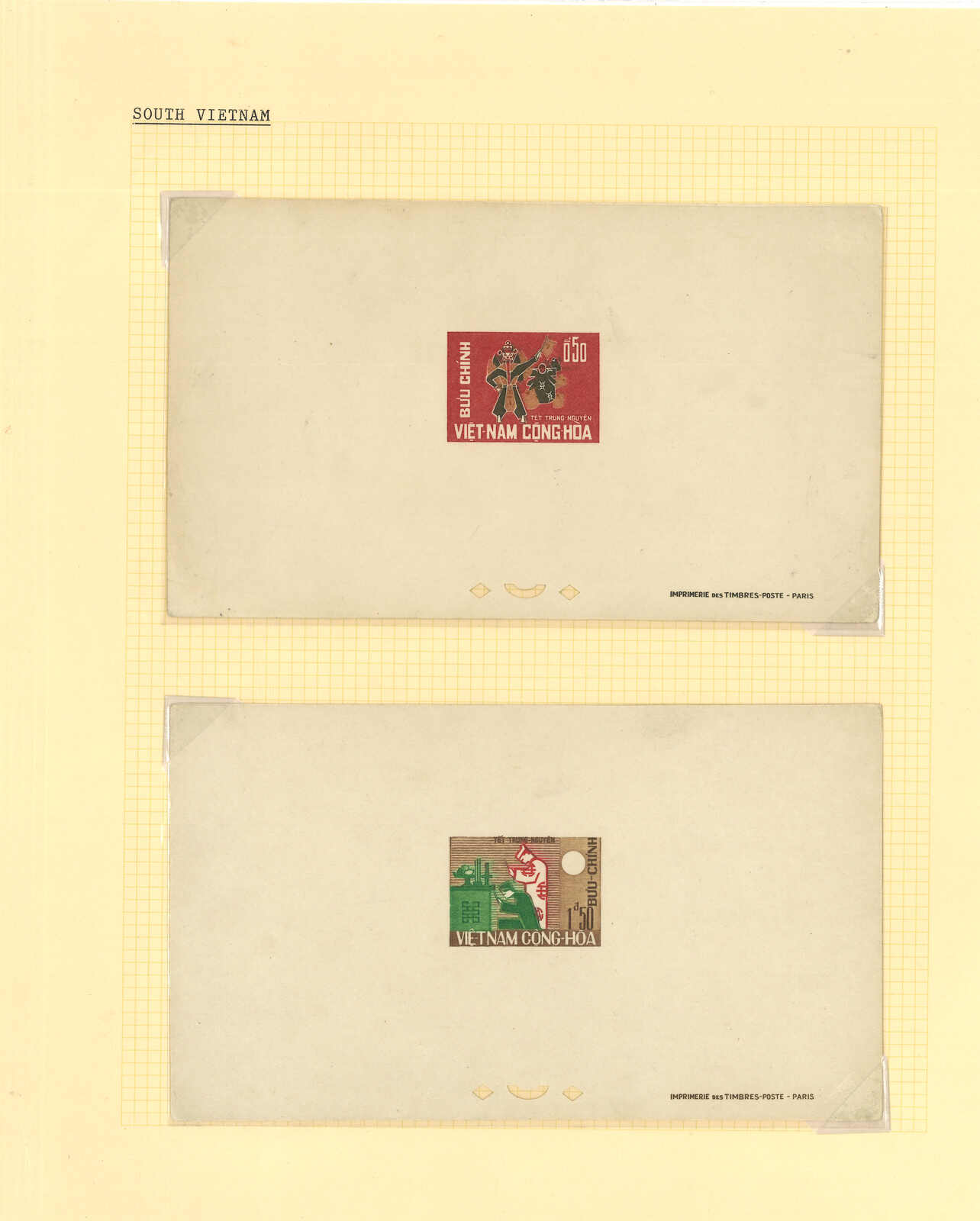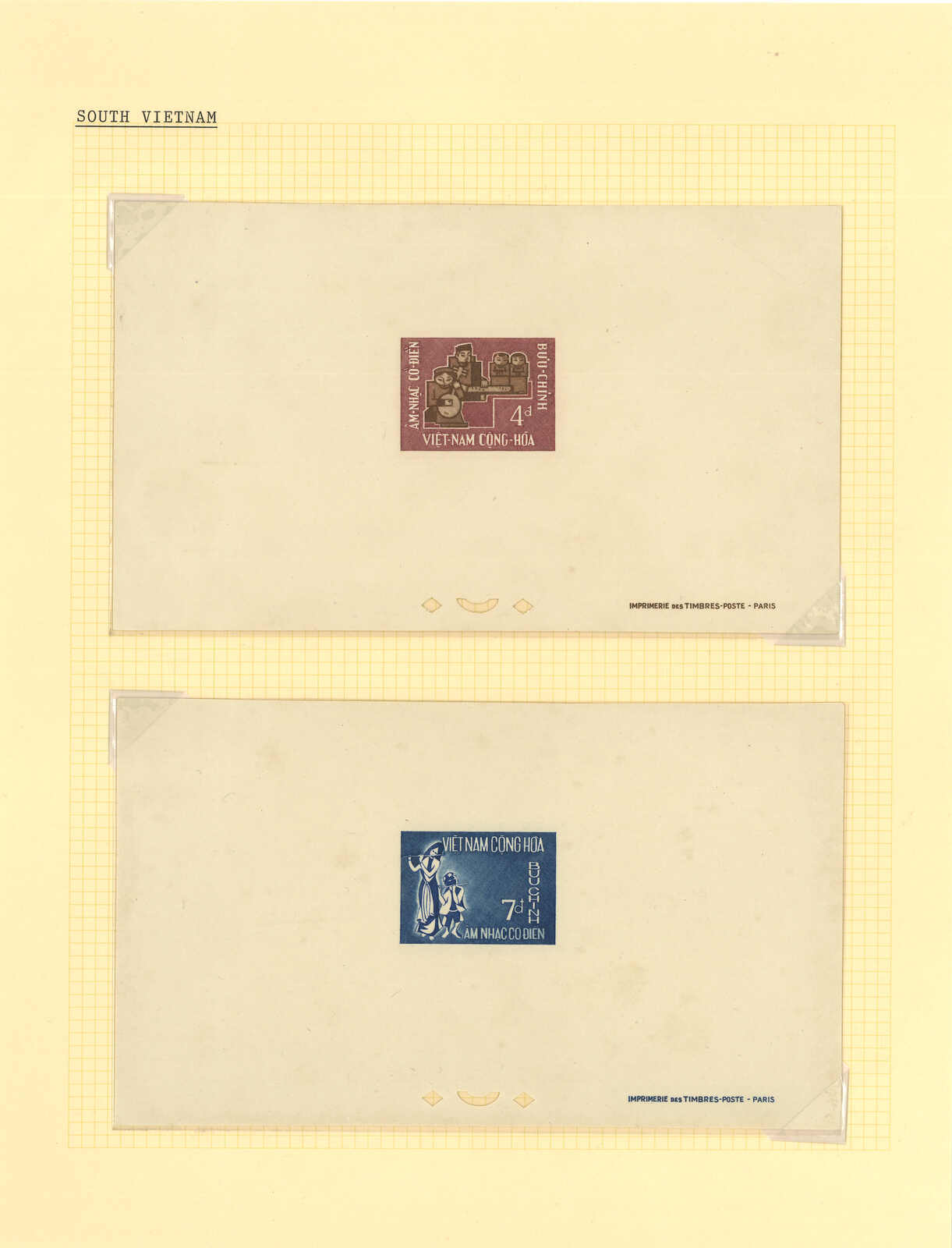 1966至1967年一組十套南越郵票之豪華試印張或無齒票,包括古代樂器、日內瓦世衛大樓、未發行之士兵票等。均無貼上品。(Image 1) (Image 2) (Image 3) (Image 4) (Image 5) (Image 6) (Image 7) (Image 8) (Image 9) (Image 10) (Image 11) (Image 12) (Image 13) (Image 14) (Image 15) (Image 16) (Image 17) (Image 18) (Image 19) (Image 20) (Image 21)