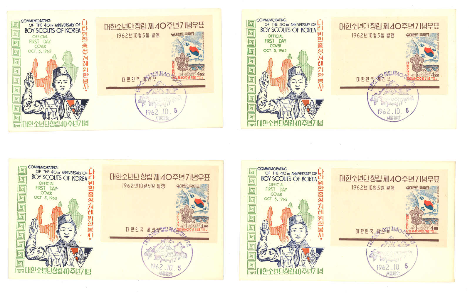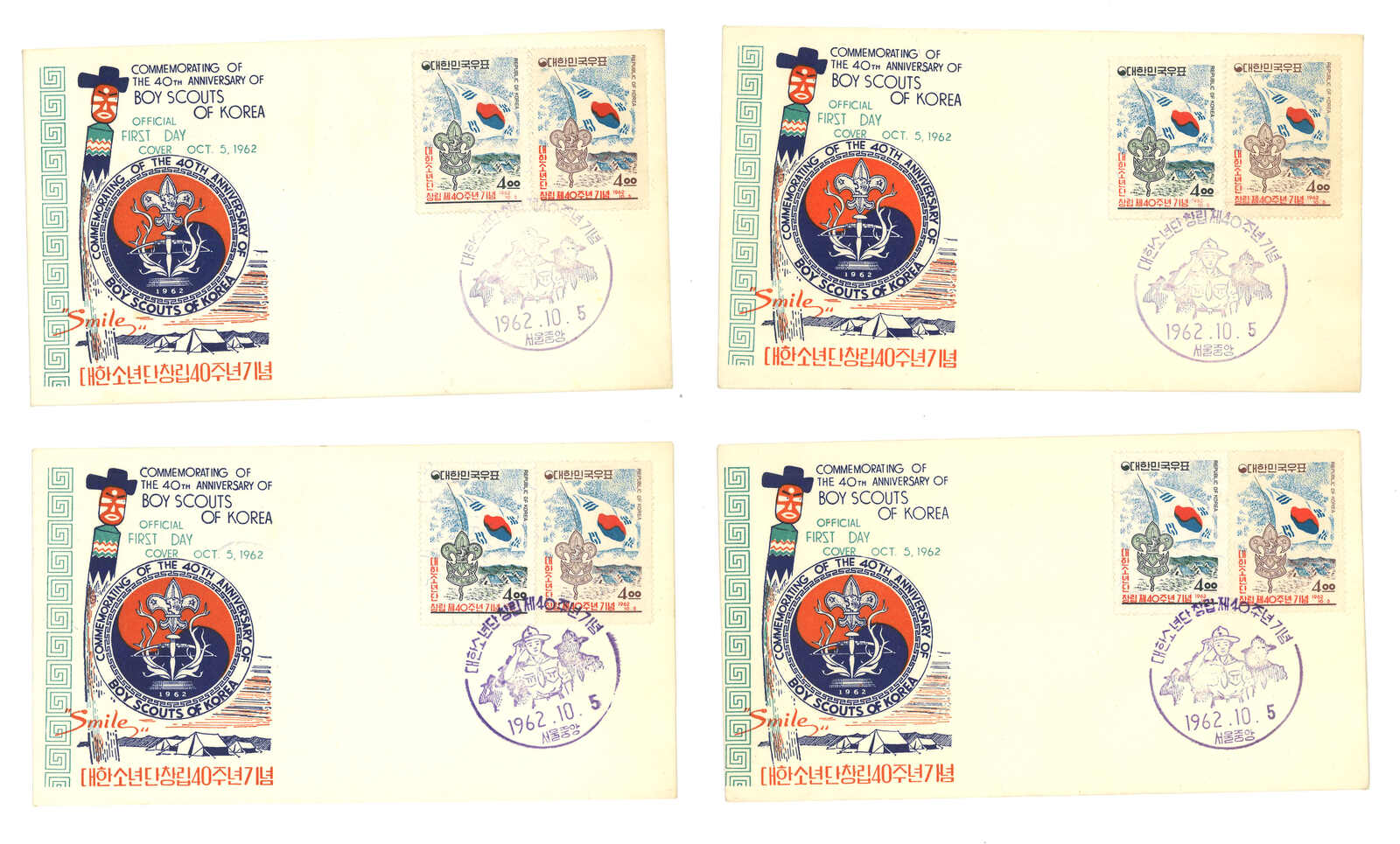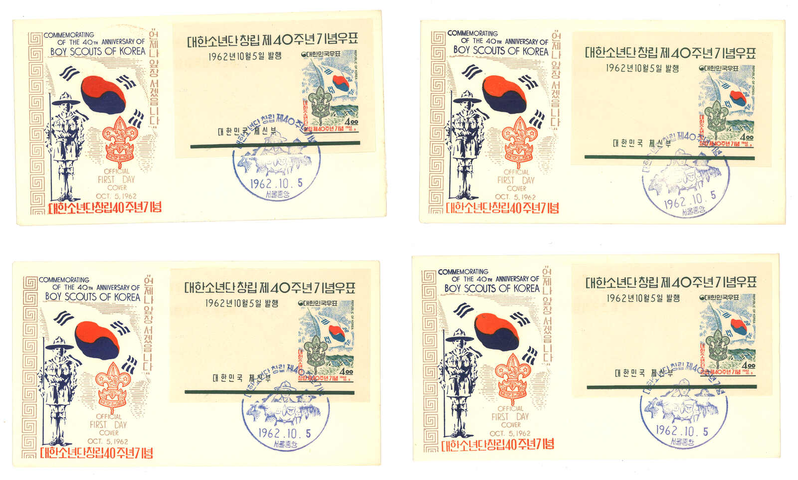 2885 image1962 (5 Oct) 40th Anniv of Boy Scouts of Korea FDC x 12 (KPDA 335-336), in which four covers f.w. complete set and eight covers f.w. S/S. Very Fine.