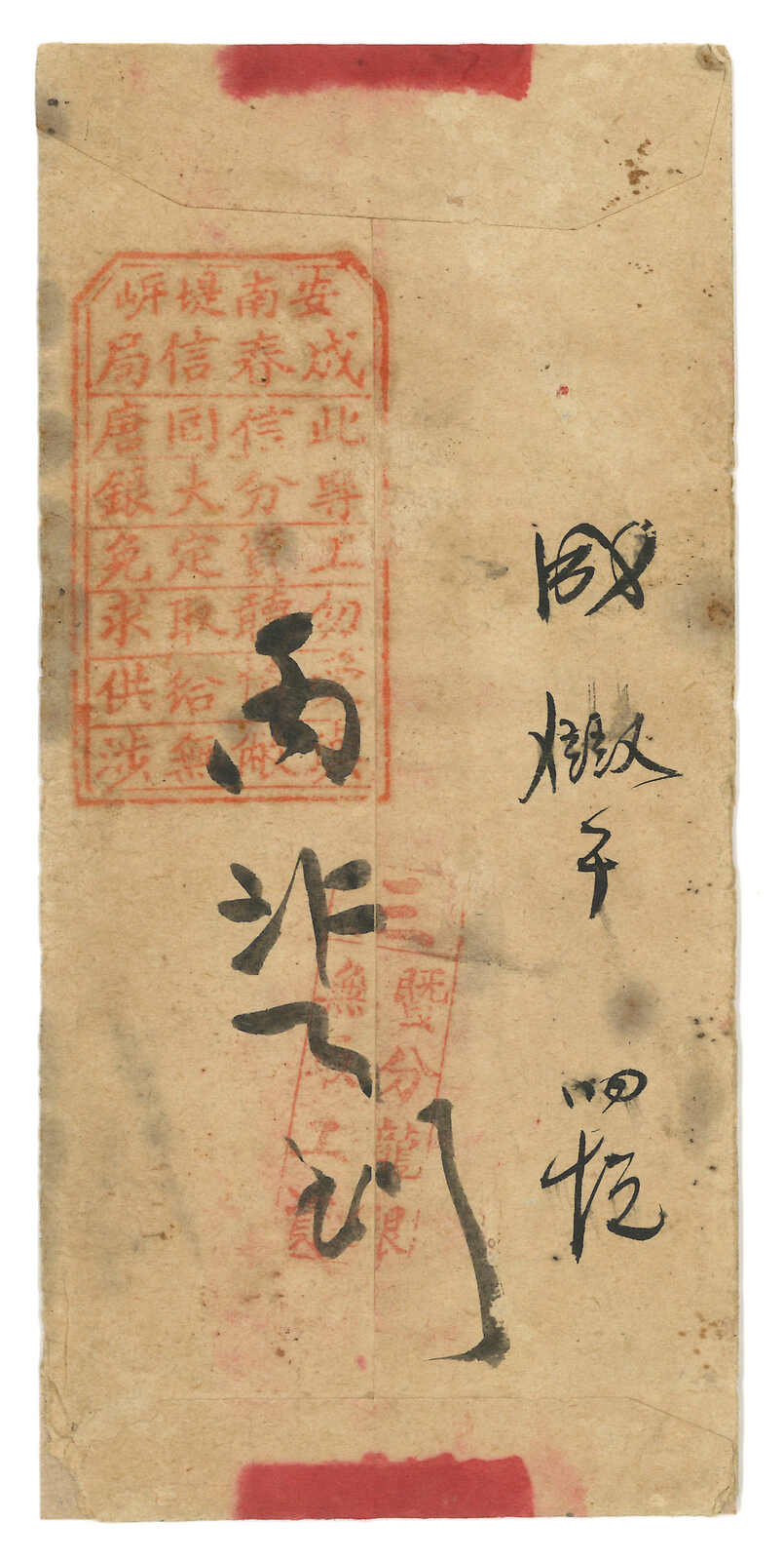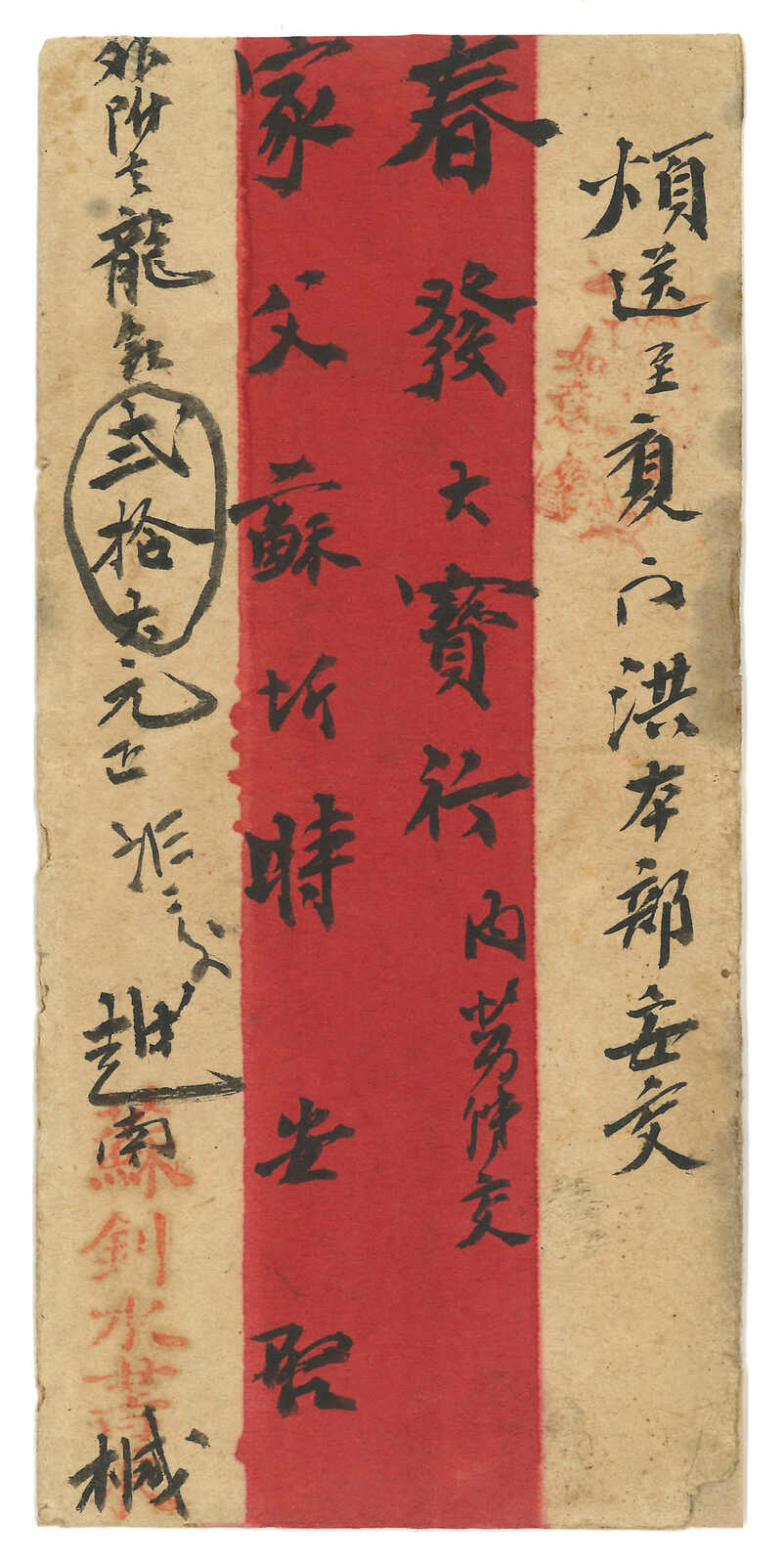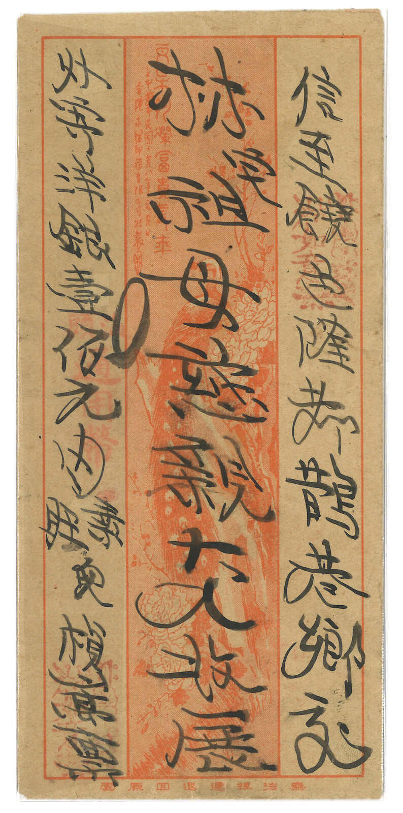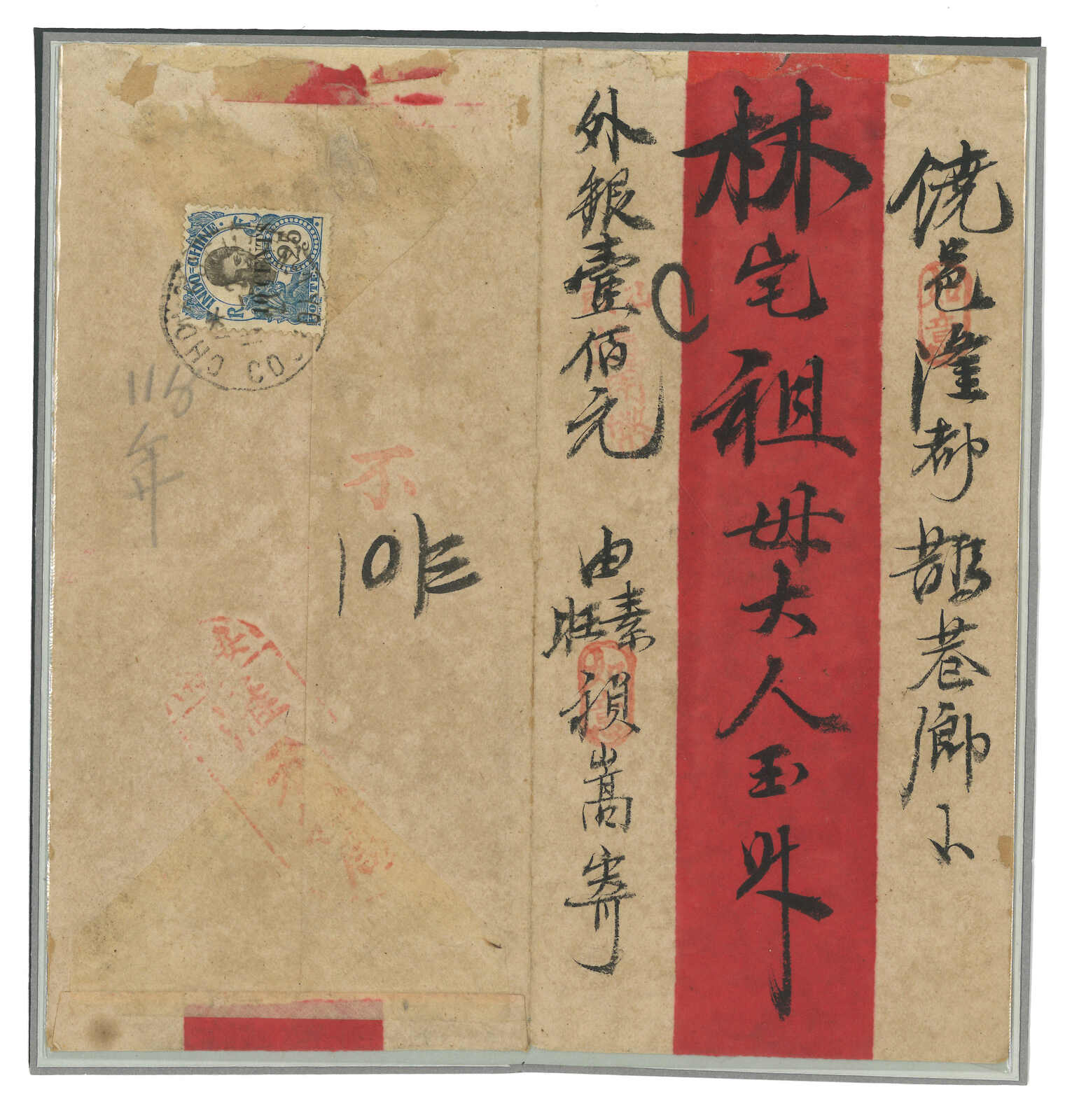ca 1910s Cholon to Amoy. Remittance red band cover, applied with Cholon Qiaopuiju seal, prefix and serial number. As no adhesive was applied, this cover was carried by bulk mail.