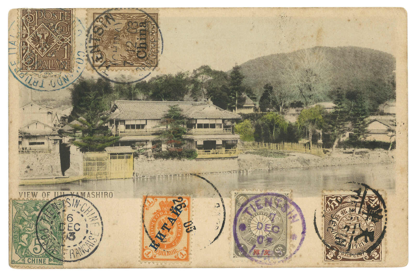 1903 a picture postcard f.w. Chinese, Japanese, Russian, French, German and Italian stamps, tied by corresponding post office cds in Tientsin.