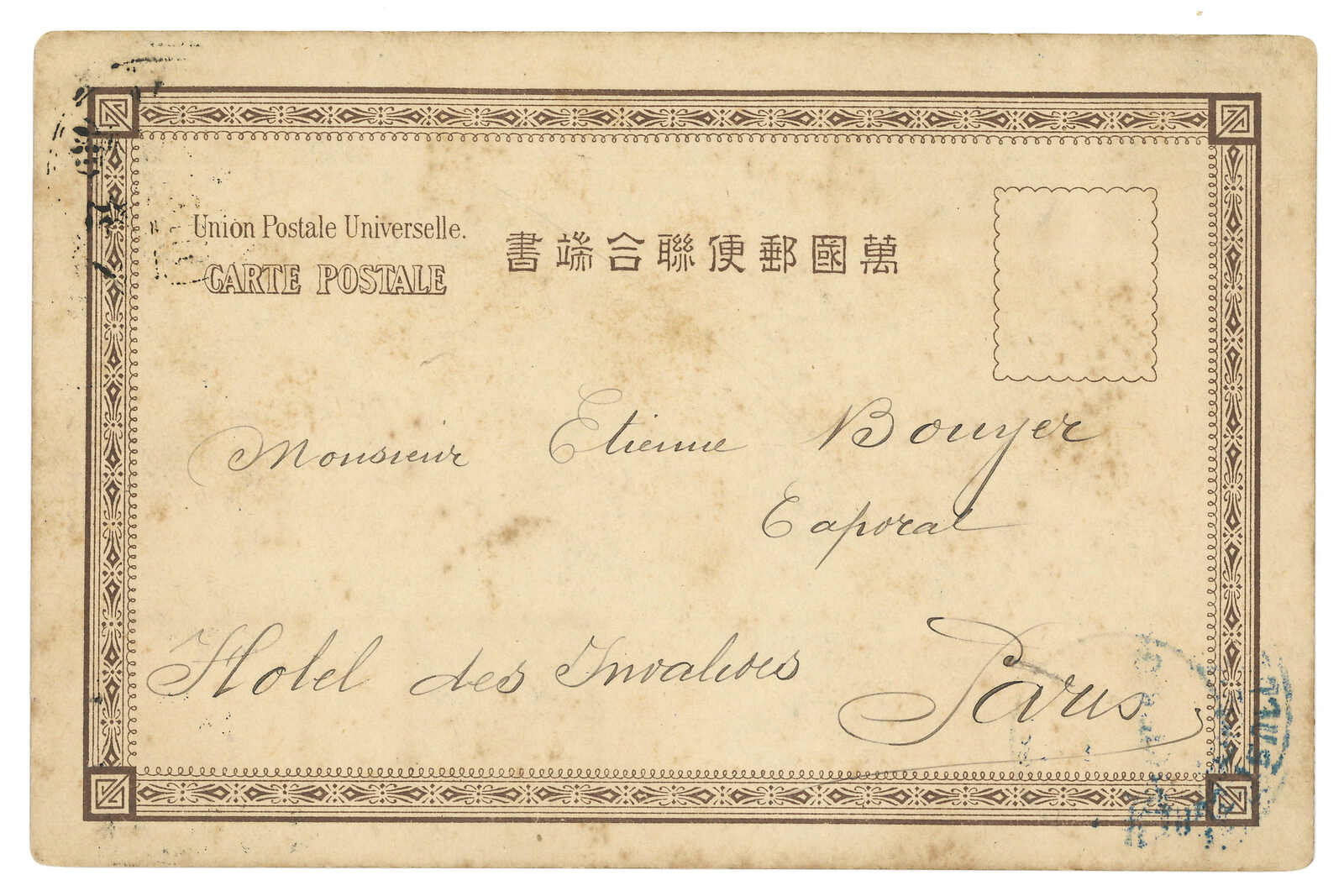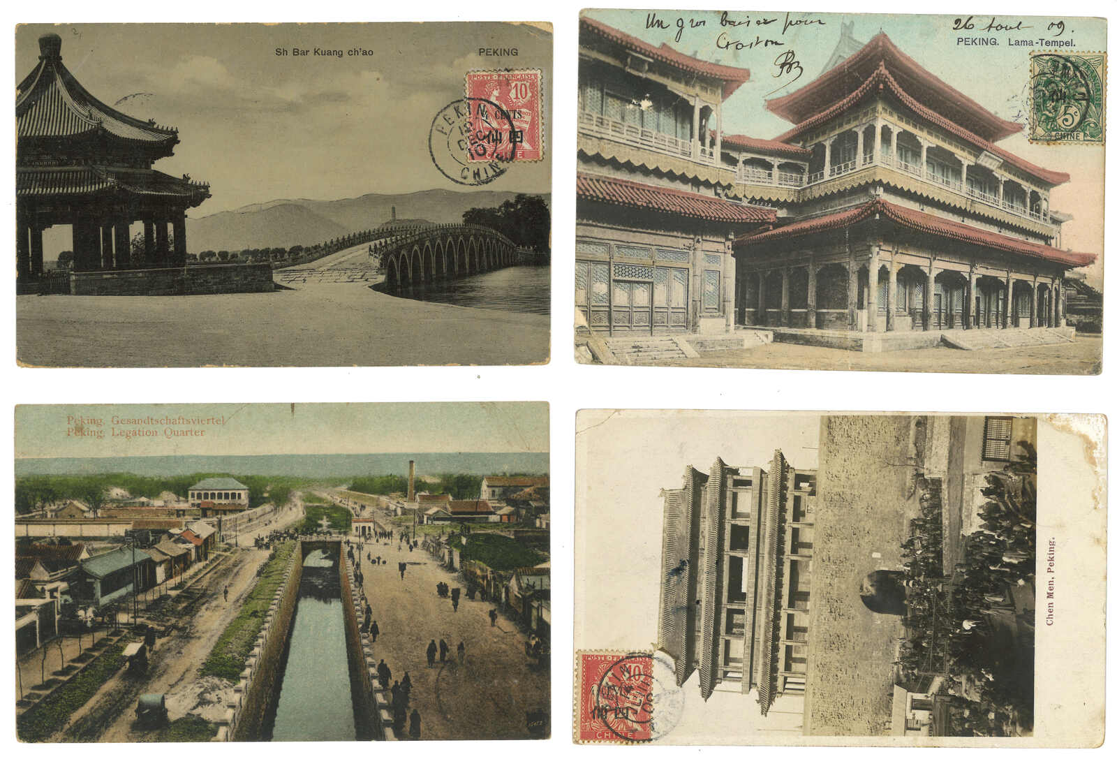 1909-1912 a group of 4 Peking view PPC, all commerically used from Peking French PO, f.w. French regular issue or applied with military unit seal. Including 3 coloured picture cards which are scarce on commerical usage.